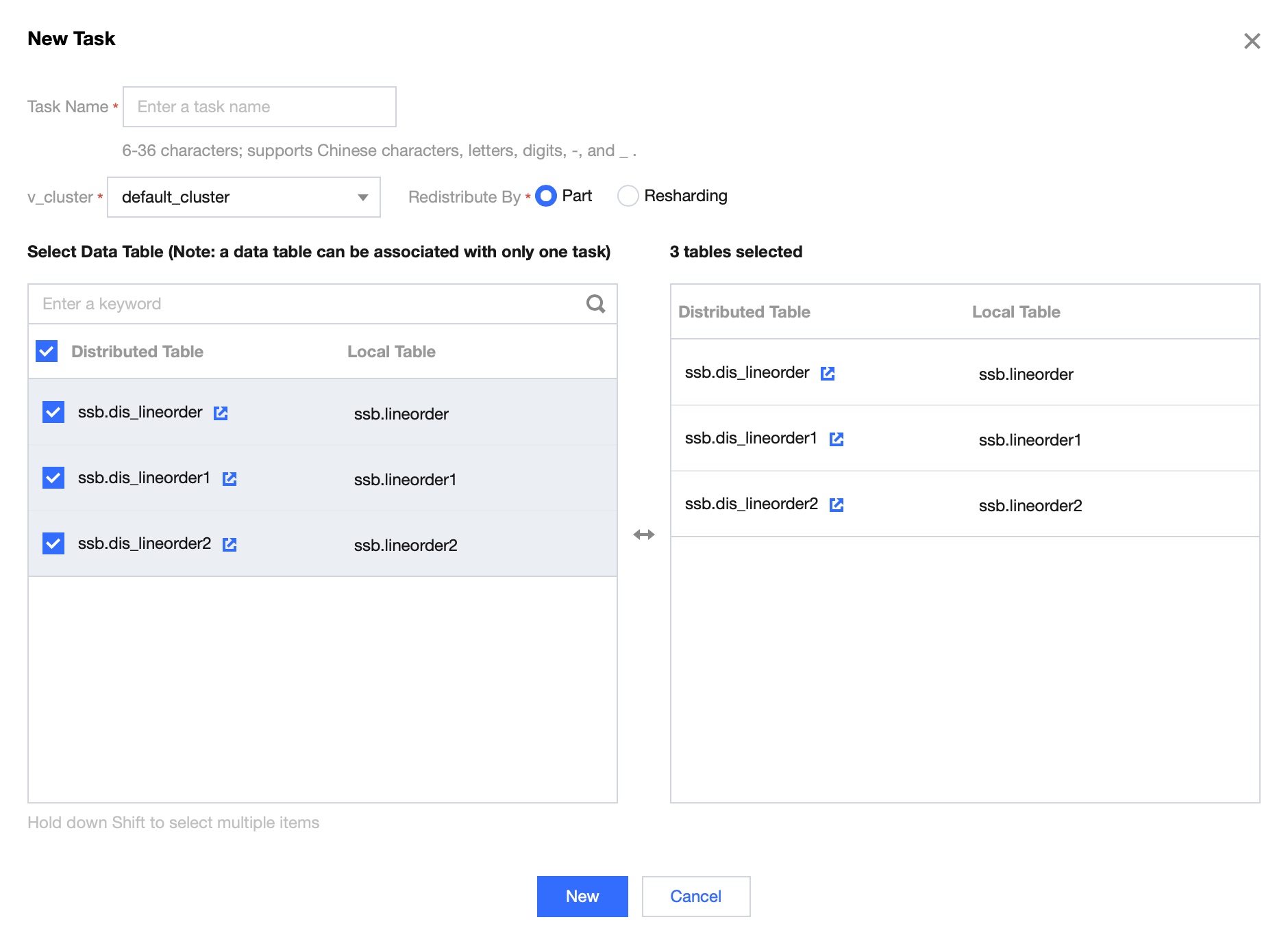 3. Click Create Task, enter the task name, select the v_cluster of the table, migration mode (part or resharding), and distributed table for redistribution, and click OK.