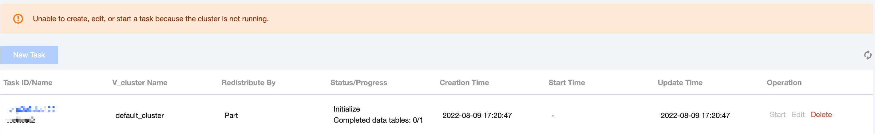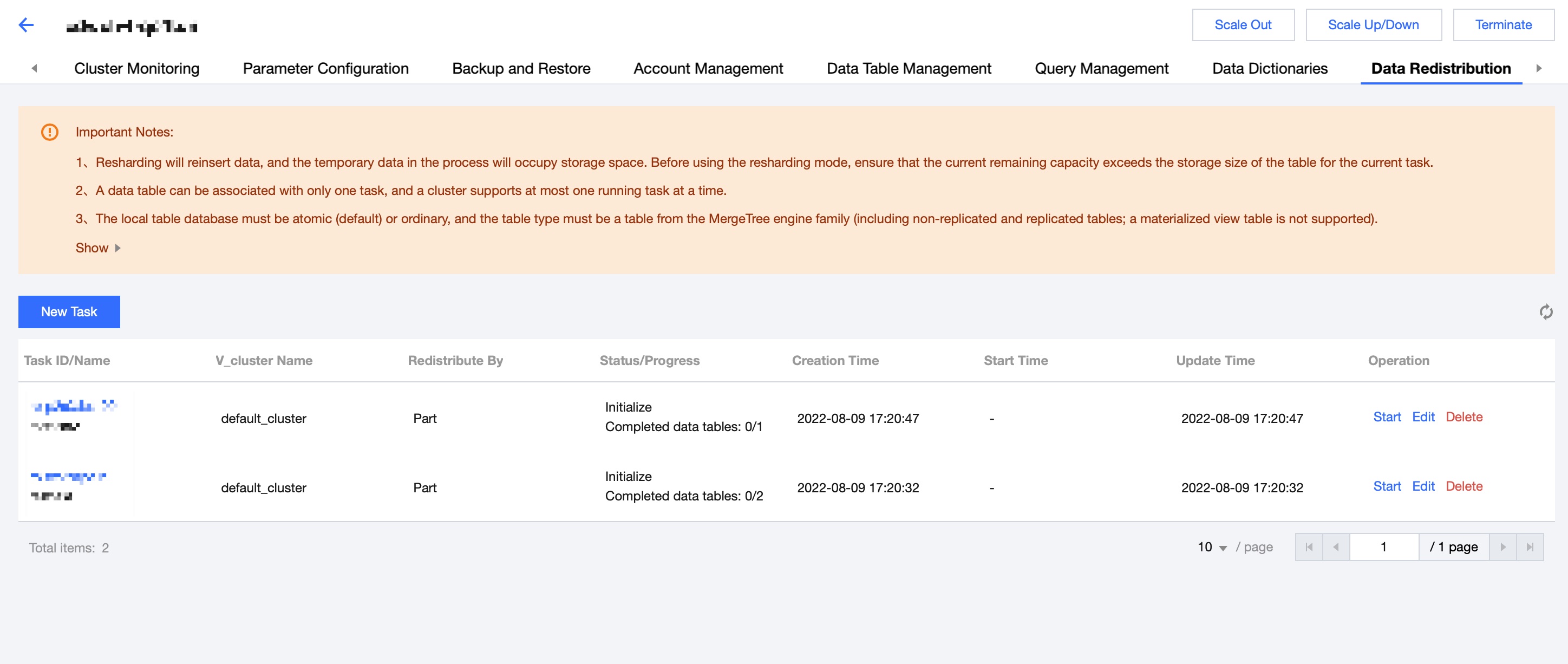 1. Log in to the Tencent Cloud TCHouse-C console, select the target cluster in the Cluster List, and click the Data Redistribution tab on the cluster details page. 2. You can view the list of existing data redistribution tasks on the current page.