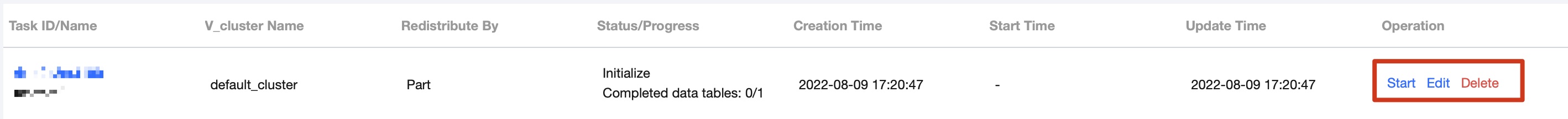 4. After creating a data redistribution task, you can start, edit, or delete it. The edit window is similar to the creation window and allows you to modify the task information.