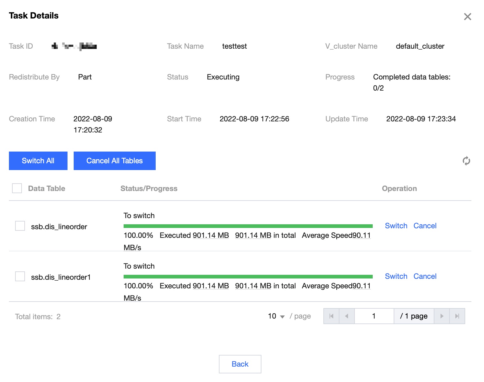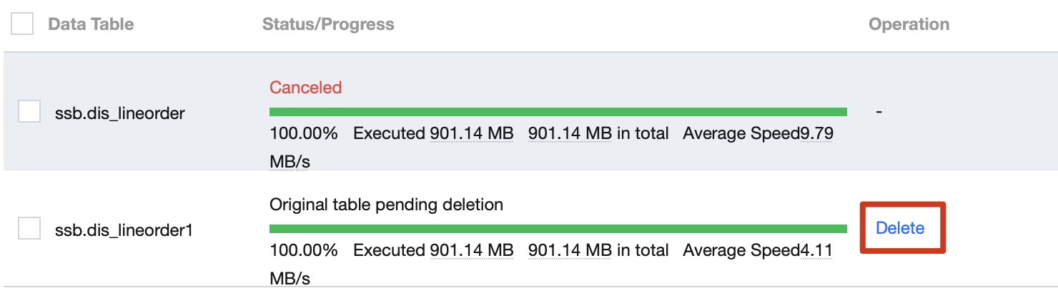 Original table pending deletion: After the switch, the data file of the original table will not be directly deleted. You need to verify the accuracy of the rebalanced data before the deletion. After the deletion, the table will enter the Executed successfully status.