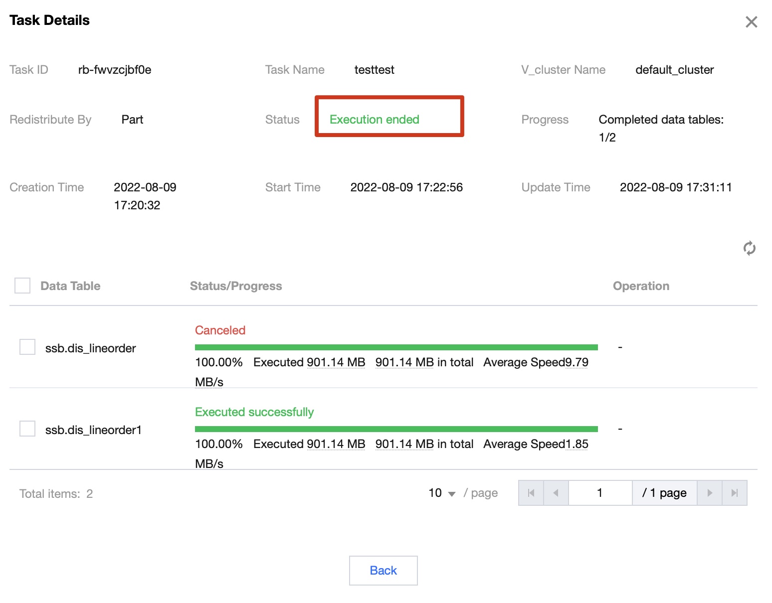 9. During task execution, if the network jitters, the ClickHouse component is restarted, or other accidents occur in the cluster, the task may enter the Paused status, with the cause displayed. You can adjust the cluster accordingly or submit a ticket for assistance. 10. When all the redistributed tables enter the final status (Canceled or Executed successfully), the redistribution task status will become Execution ended, and the Tencent Cloud TCHouse-C instance status will become Running.