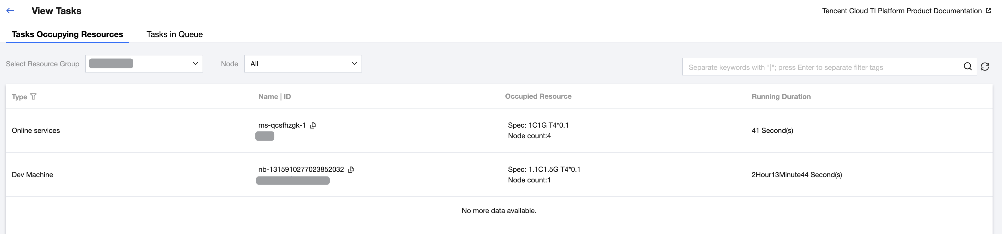 By going to the Occupied Resources Tasks tab page, you can view all the tasks that are currently using resources under this resource group. At the same time, you can switch resource groups on this page and select a specific node to view details.