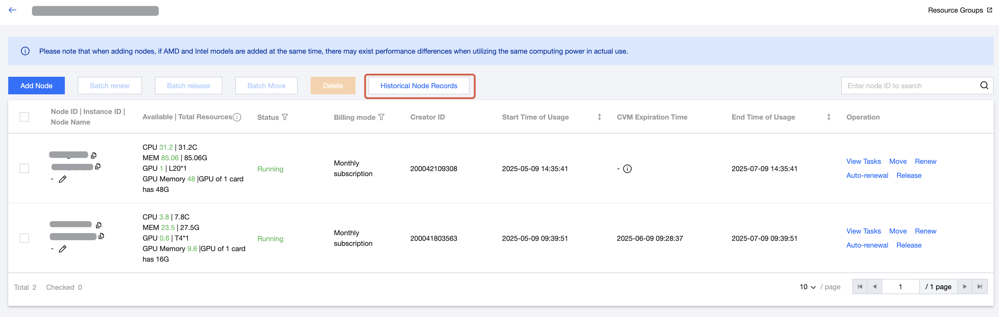2. Click a resource group name "selected from CVMs", and then click Add Node to go to the purchase page.