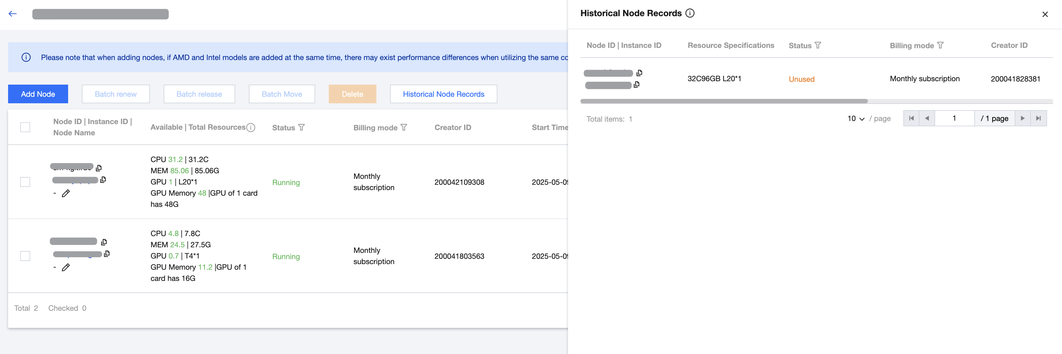 By entering a resource group, you can click Historical Node Records to view the list of nodes in "Failed to deploy" and "Unused" statuses.