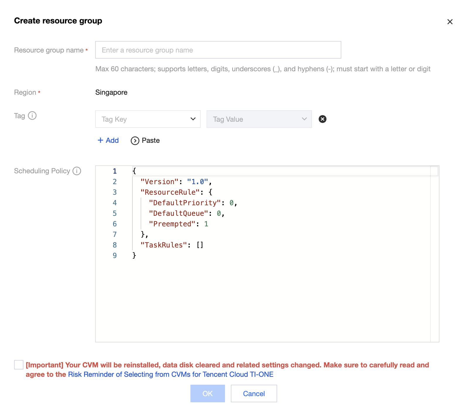 5. Enter a resource group name, select the risk warning, and click OK to complete your creation.