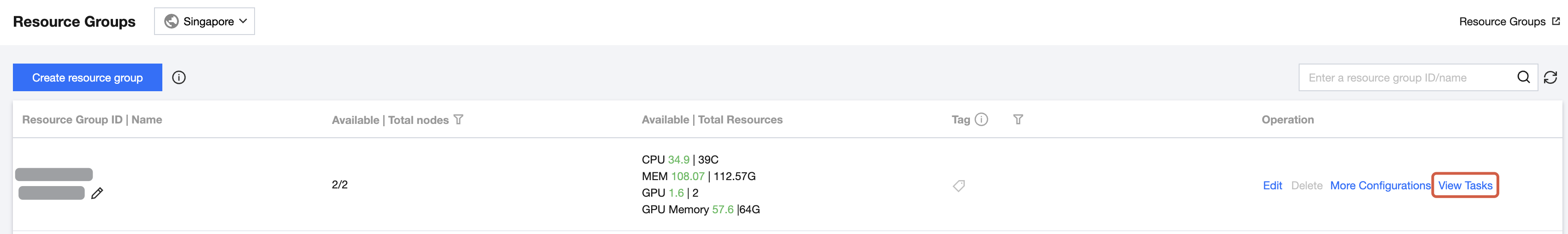 Click View Task List on the resource group list page to view the tasks that use resources and the tasks in queue under this resource group.