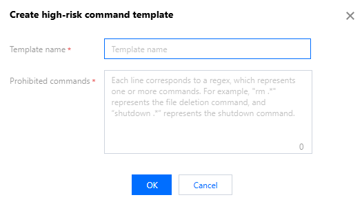 4. In the Create High-Risk Command Template popup, configure the template name and specify the commands to be prohibited.