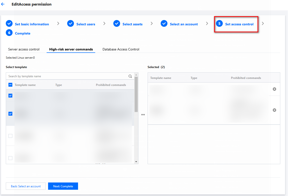4. On the Edit Access Privileges page, go to Step 5 and configure the high-risk commands for the access permission's host.