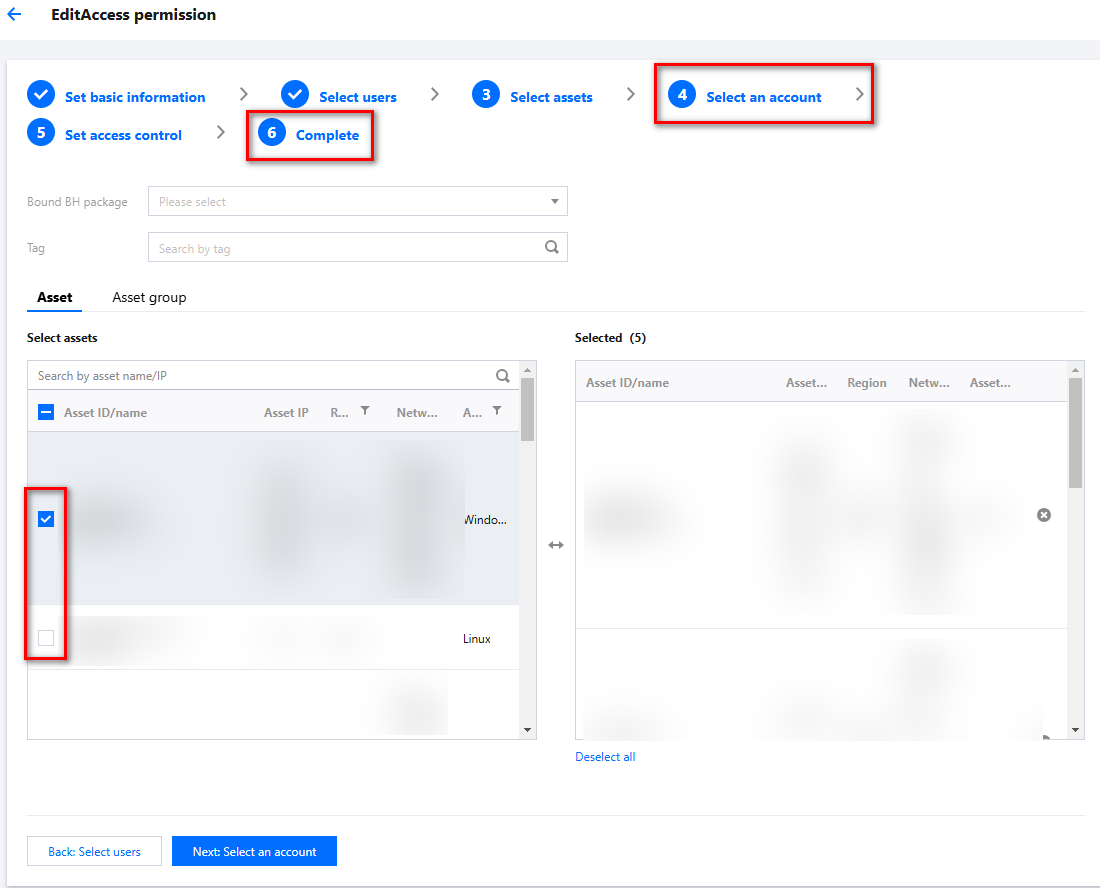 3. On the access permissions editing page, click Select assets, then click to check the required account, and click Next: Select an account > Submit to save the settings.