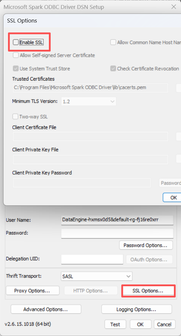 Uncheck Enable SSL (based on the actual private network environment configuration of DLC, normally disable for private network/VPC access, enable for public network access, refer to the actual allowlist description for details).