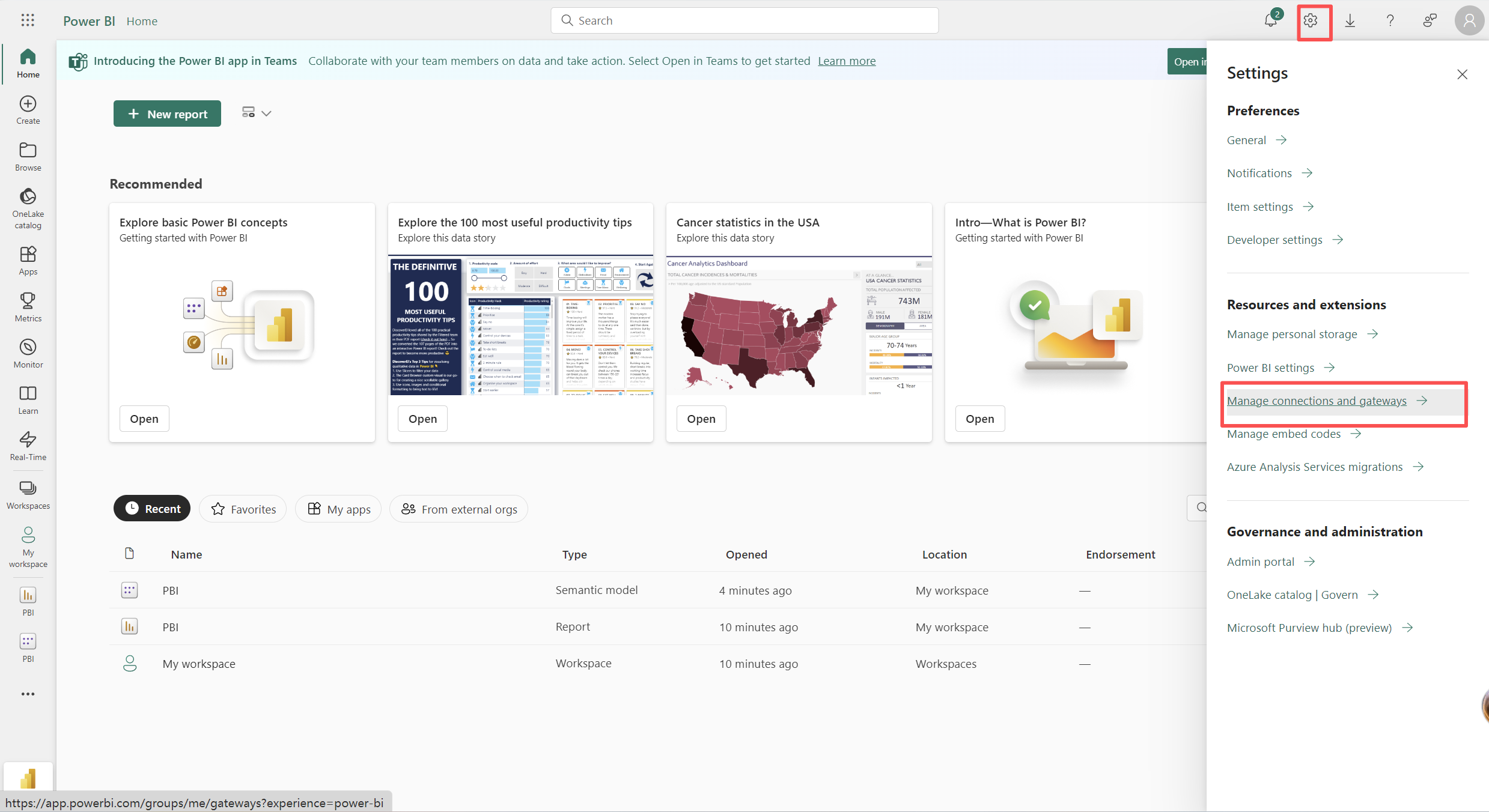 2. Click in the upper right corner gear icon, select Manage connections and gateways.