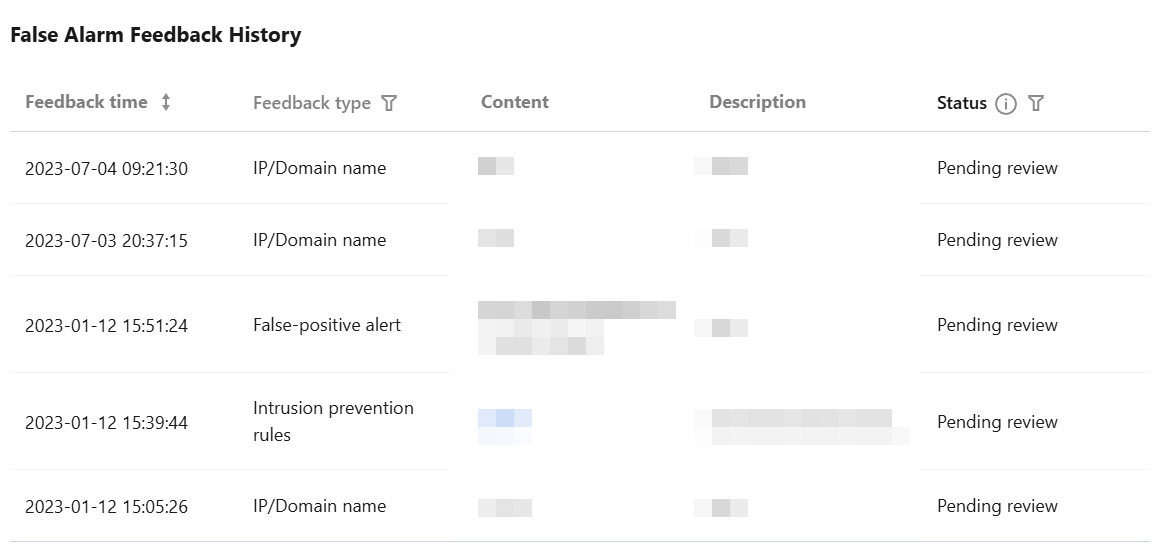 3. Click Submit feedback to submit feedback on false positives. The records of false positive feedback will be displayed below on the page. CFW staff will complete the assessment and provide feedback on the processing results within 3 business days.
