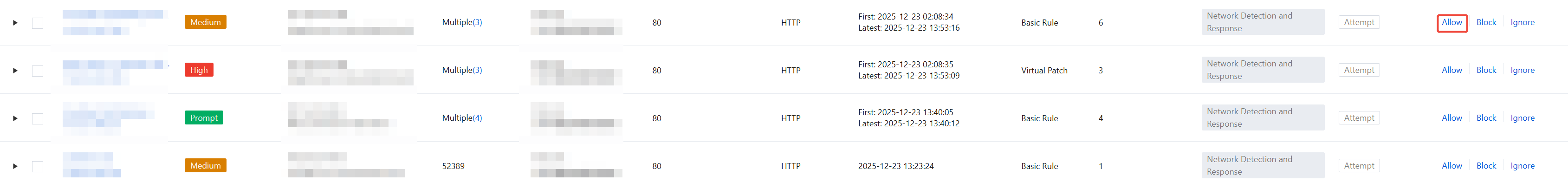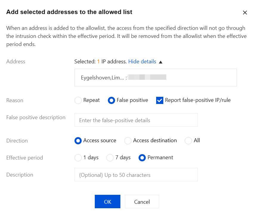 1. When you find that an alarm is a false positive, click Allow in the operation bar to add the false positive IP address to the Allowlist strategy (allowlist) of the Intrusion Defense module. 2. In the pop-up window, select False positive as the reason for allowing and report the address/rule of the false positive. After filling in the description of the false positive below, click OK to complete the feedback.