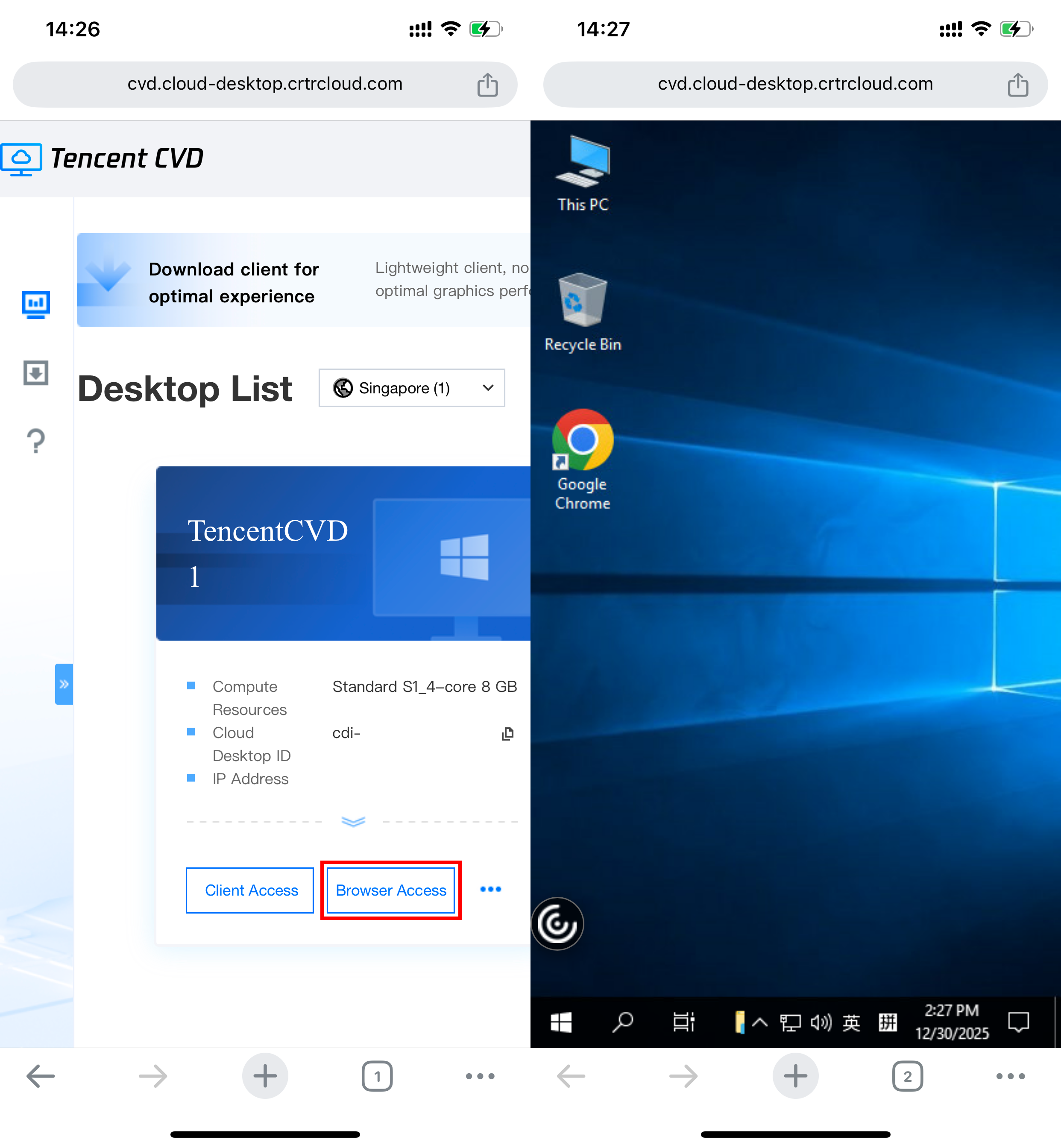 3. After logging in, you can access the CVD instance through browser access or client access.