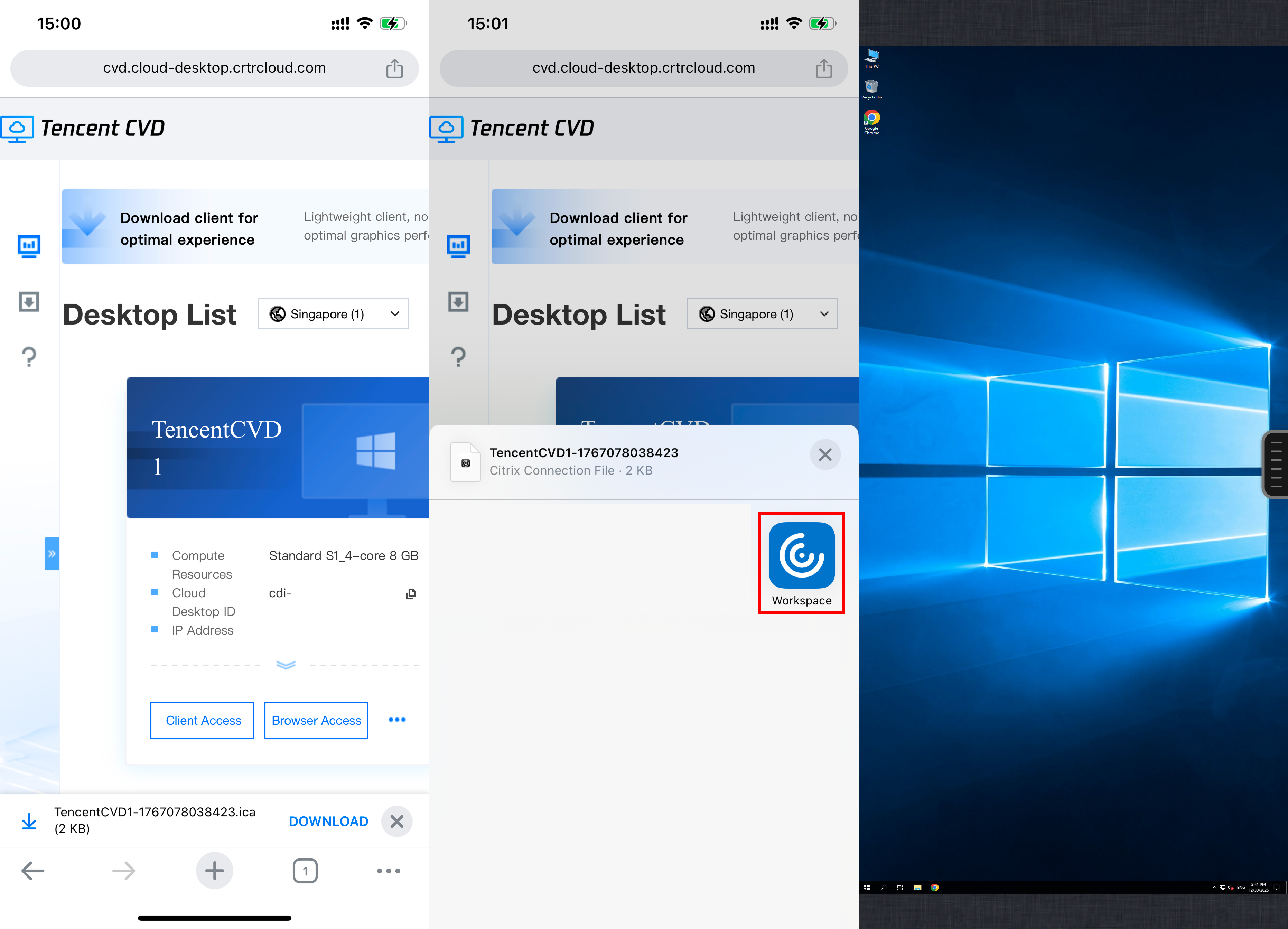 Client access: In the CVD instance list, click Client Access. Then, download the access ticket and choose to open it with the Workspace client. This redirects to the Workspace client and launches the CVD instance.