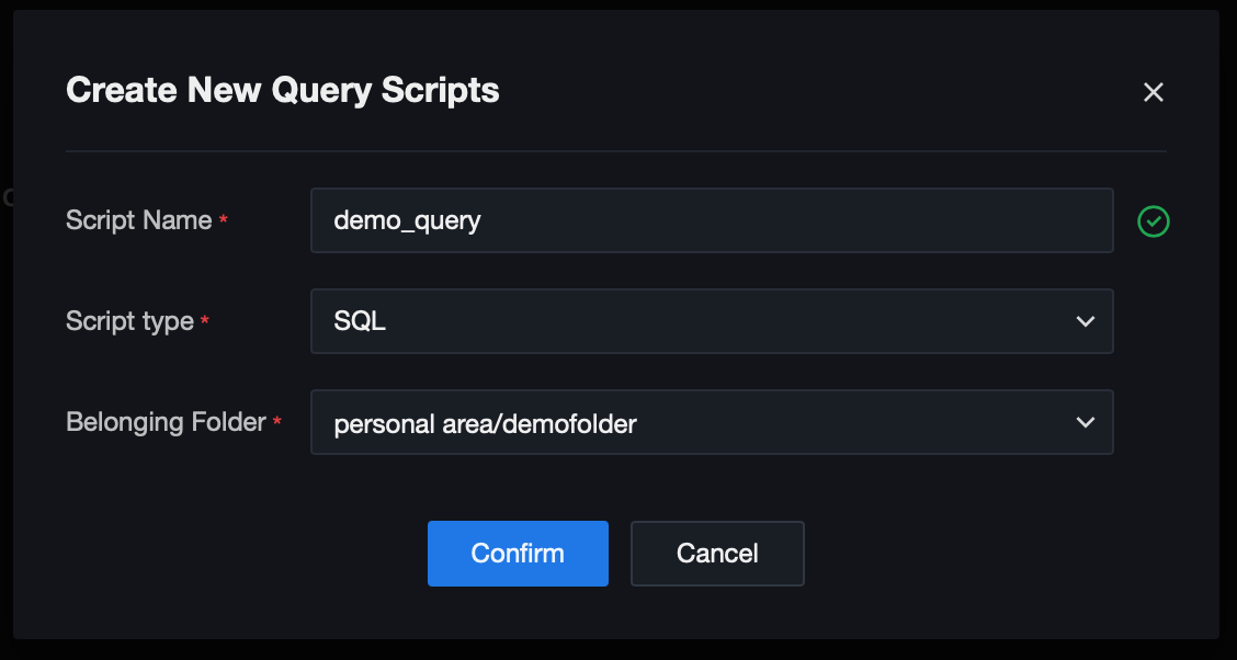 Fill in the script name, select the script type and folder, then click OK to create the instance successfully.