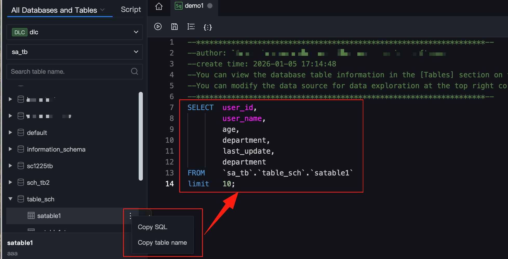 1. In the directory on the left, select a data table, click More > Copy SQL > Copy table name to copy the query statement and table name of the data table.