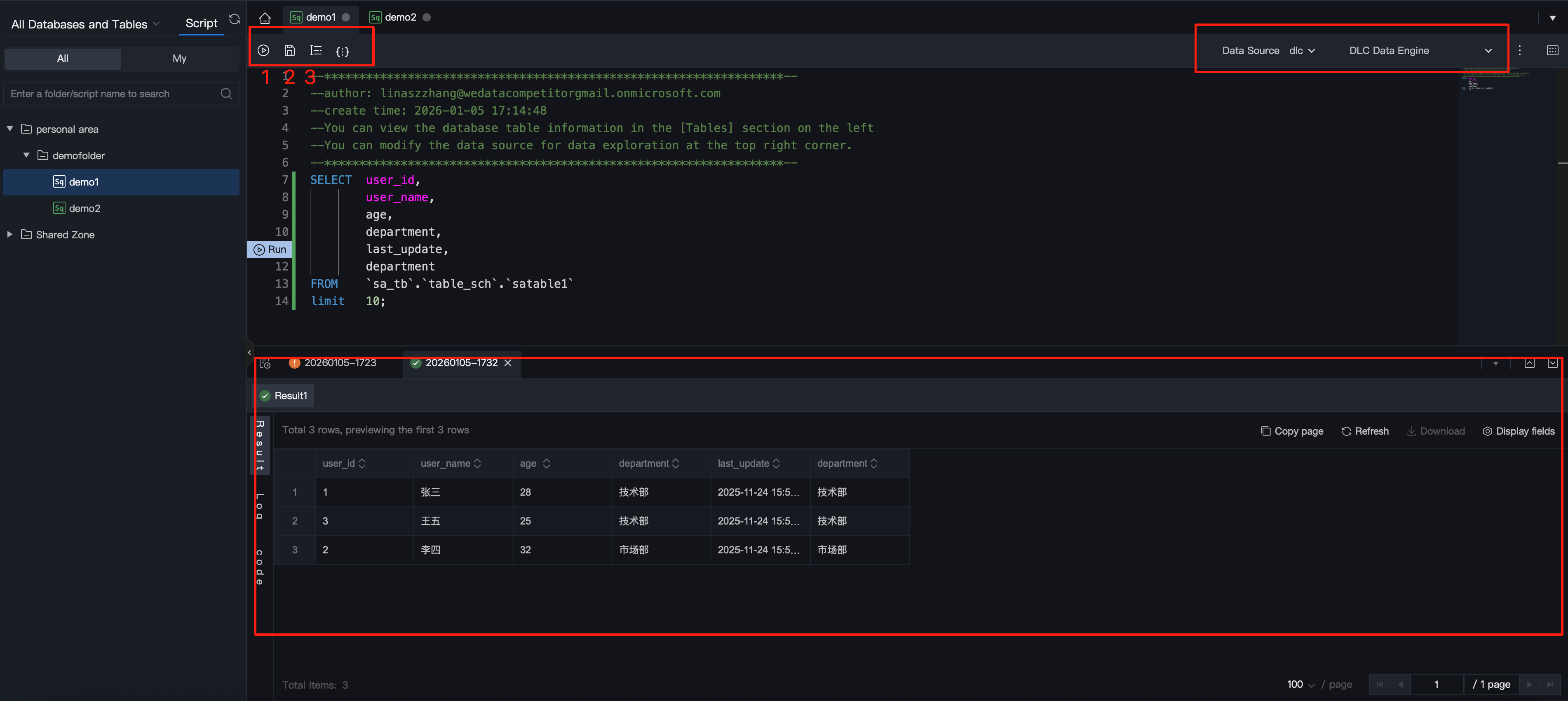 execution resource | Computing resources for execution of the current query script currently only support selecting "data exploration experience resource group". Note: Note: During the beta testing stage, users can use the "data exploration experience resource group" for free, with supported performance parameters of 20 concurrency per root account. Commercial billing will apply after completion. |