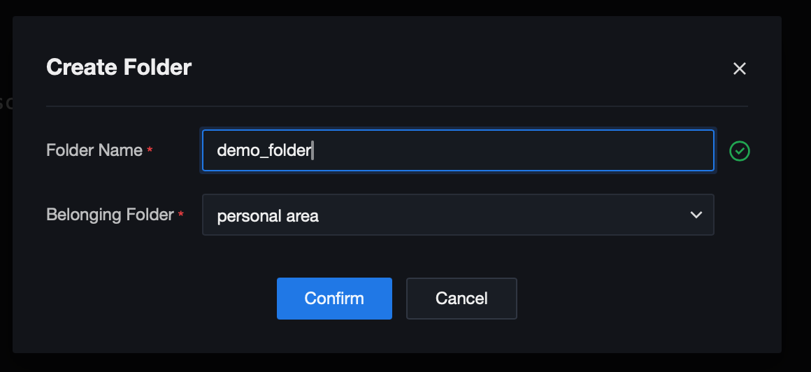 Fill in the folder name, select the folder, and click OK to create the instance successfully.