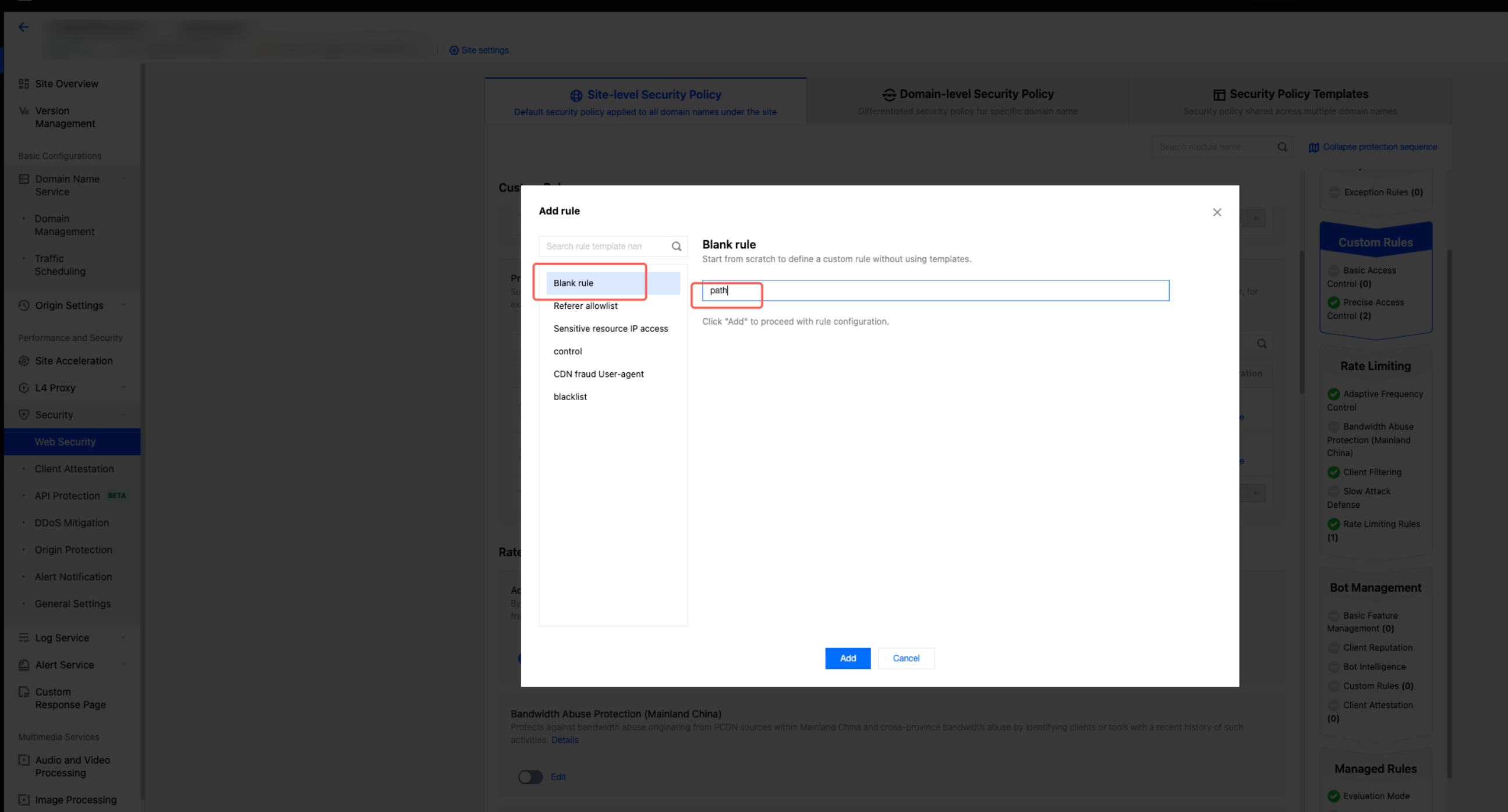On the left sidebar, select Site acceleration, click Rule engine, and configure TypeB authentication.