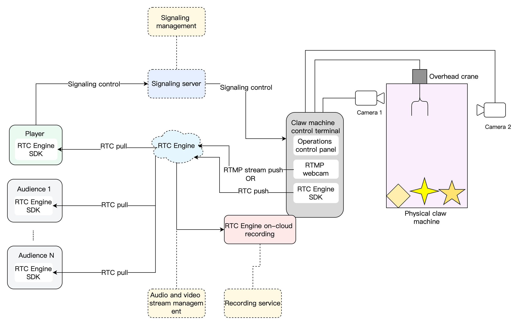 The overall business architecture of the online claw machine is as follows. The control end of the claw machine is equipped with two camera positions for video capture and streaming. When players enter the game interface, they join the corresponding RTC Engine room linked to the claw machine, allowing them to view the video stream captured by the claw machine’s cameras. After inserting coins or topping up, players can start controlling the claw machine’s claw to grab toys. The audience can also join the game to watch the player’s claw-catching process.