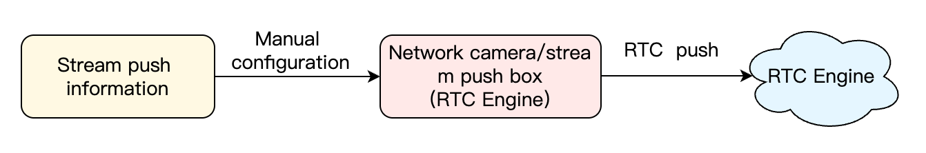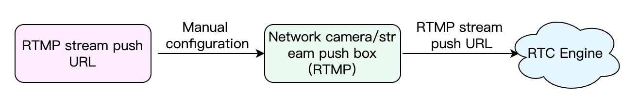 Most network cameras or streaming boxes on the market support RTMP streaming. By using the RTMP streaming into the room feature of Tencent Cloud RTC Engine, you can directly push video streams from network cameras or streaming boxes to RTC Engine rooms. The specific process is as follows: