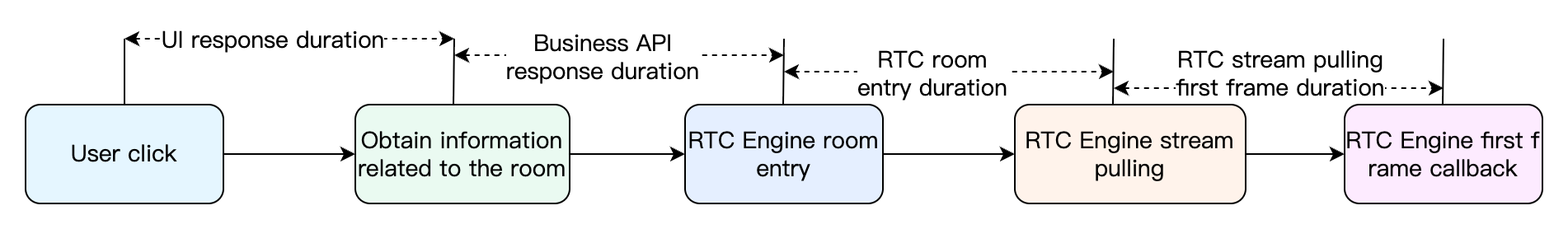 In the online claw machine or coin pusher scenarios, the first frame loading speed directly affects users' experience of entering the live streaming room. First frame time refers to the total duration from when a user clicks the live streaming room to when the visual is first rendered. The bottleneck may exist in the response of business APIs (including the authentication and room information obtaining) or in the competition between the business component loading and stream-pulling network resources. Therefore, it is necessary to perform instrumentation analysis on the key link to locate the bottleneck and perform targeted optimization accordingly, as shown below.