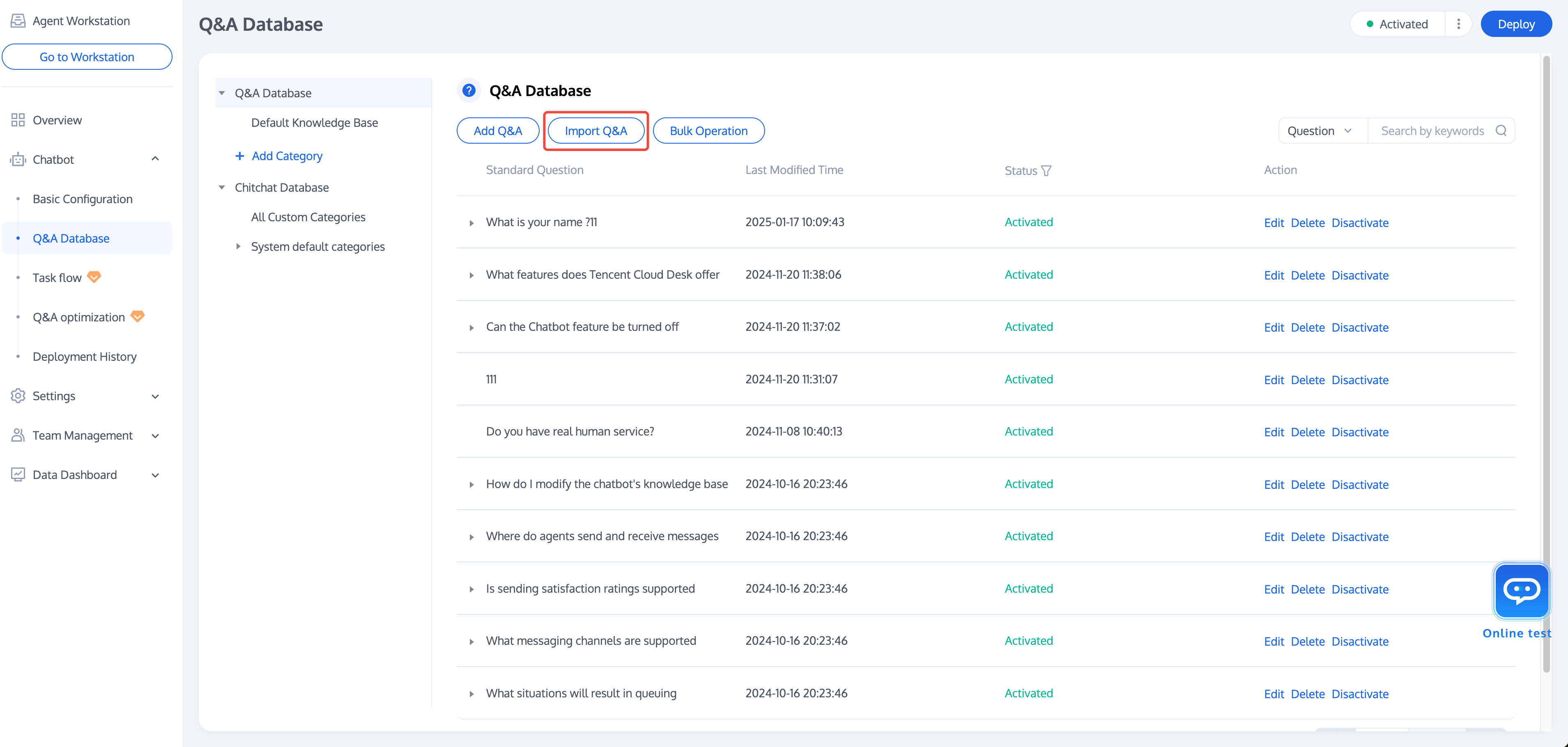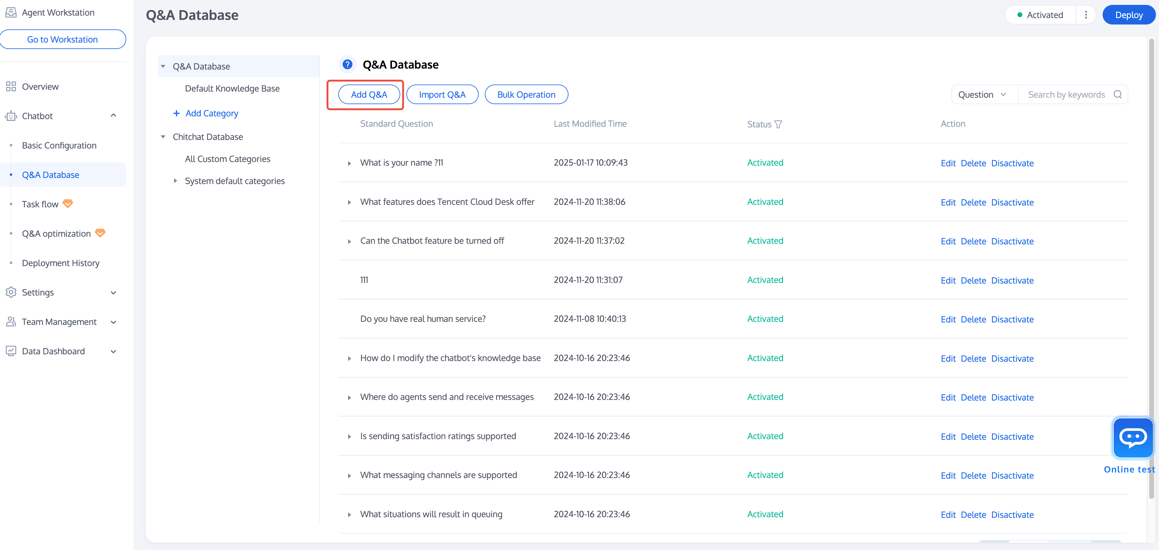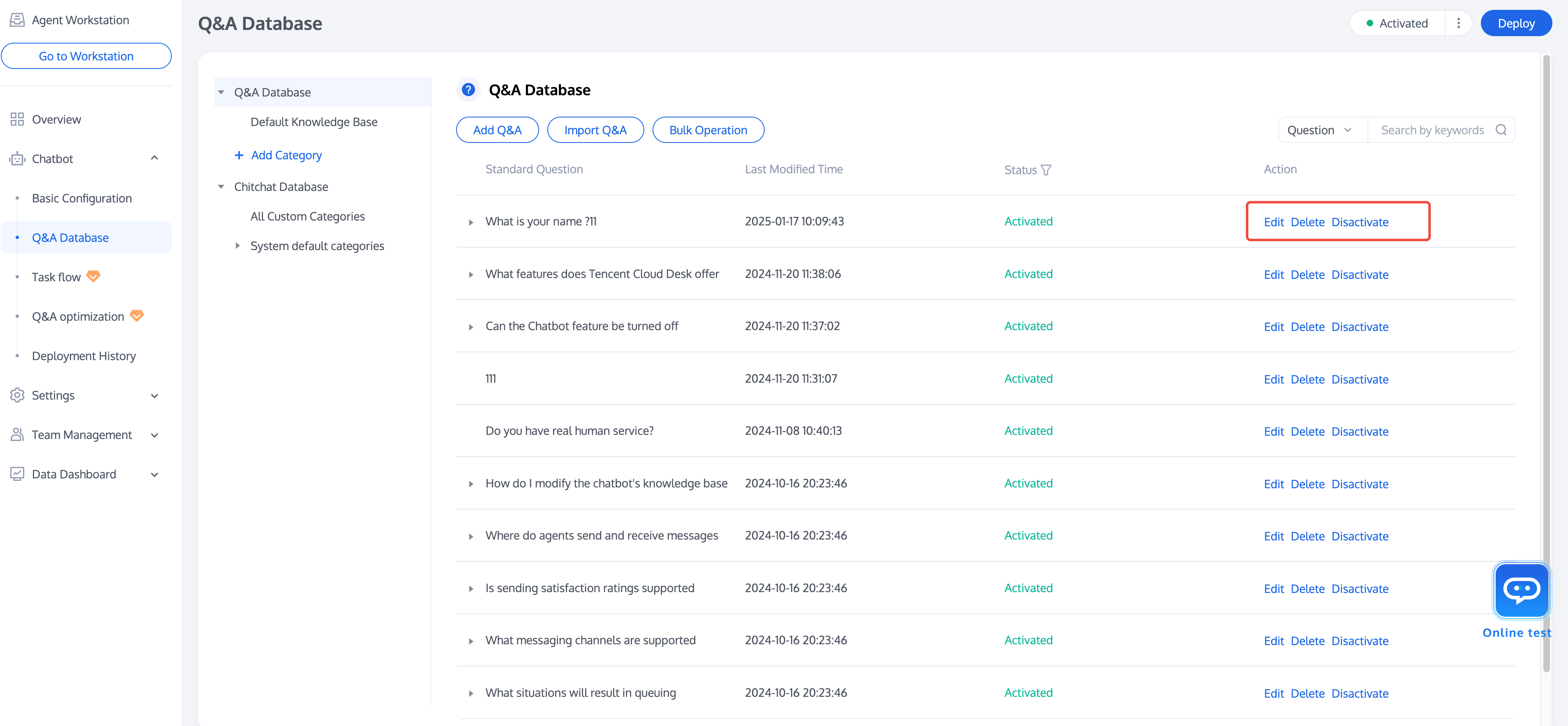 After uploading the Q&A, you can perform Edit, Delete, Disactivate operations on the Q&A in the operation area on the right side of the question. If you need to perform batch operations, you can also click Bulk Operation below the Q&A database to perform batch operations on the selected Q&A.