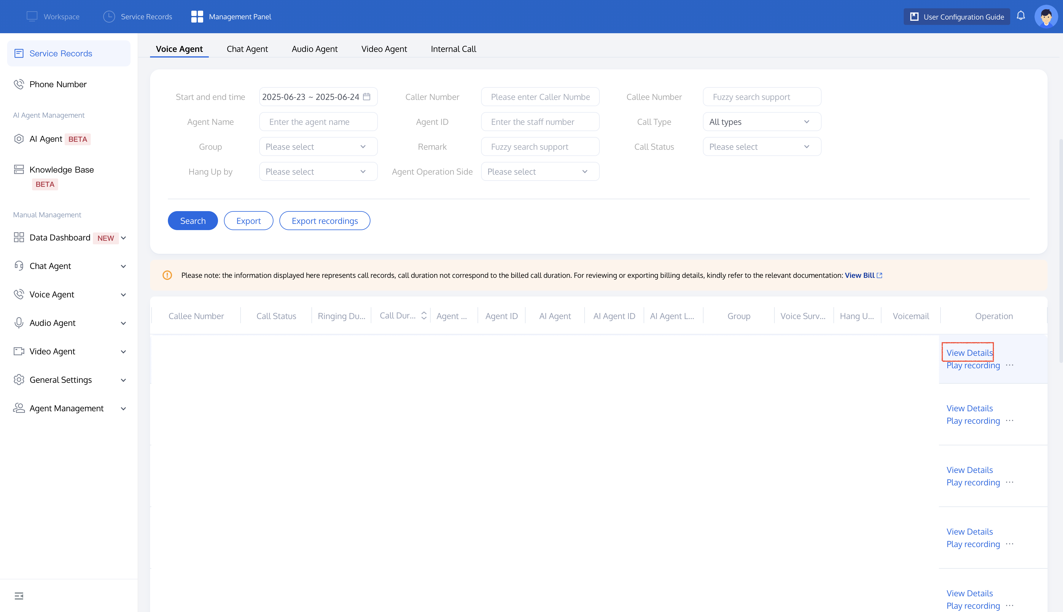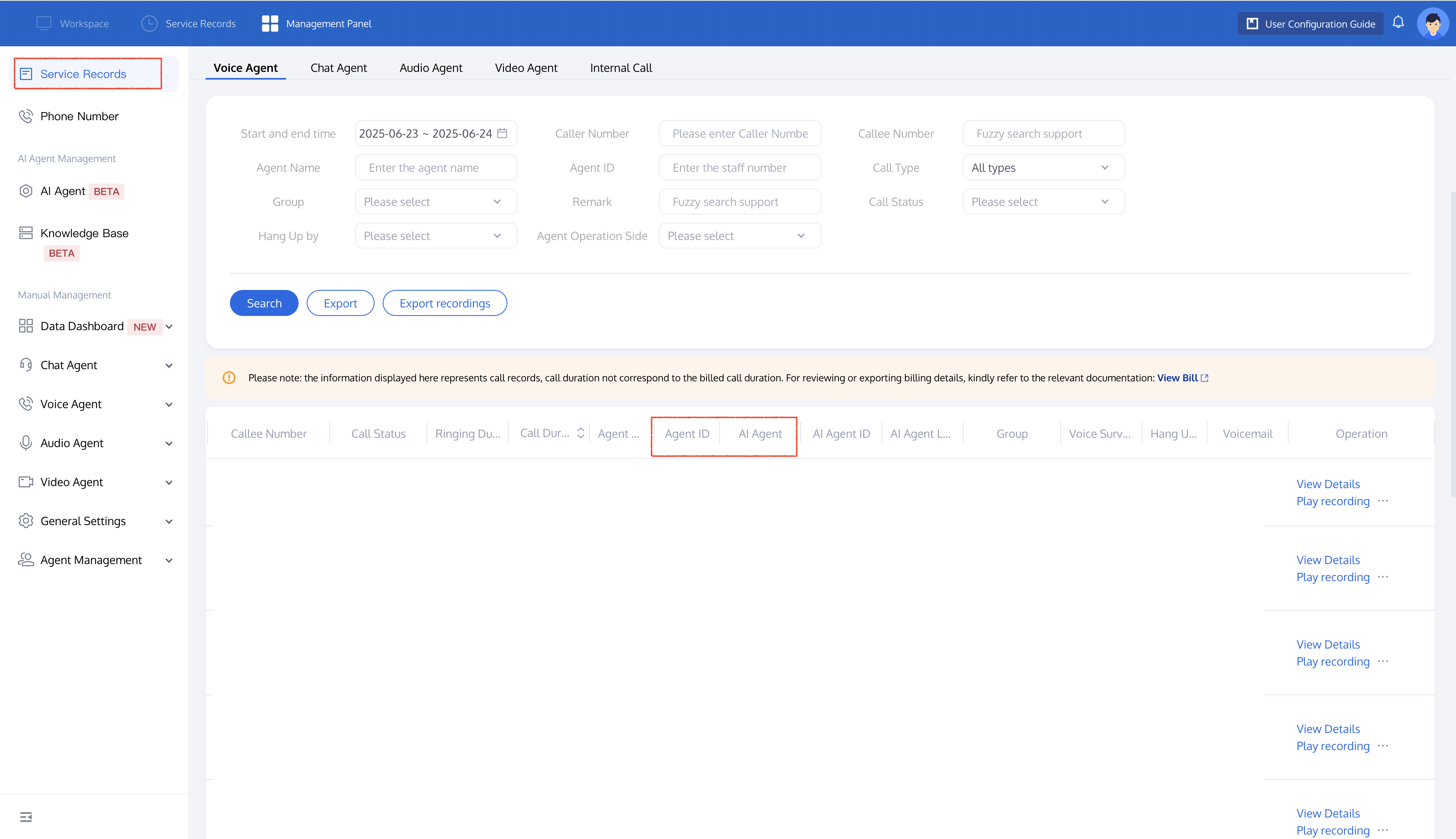 After an AI Agent call ends, you can easily access the call records and voice recordings in the service record. For more details, check out the Service Record & Recording Playback.