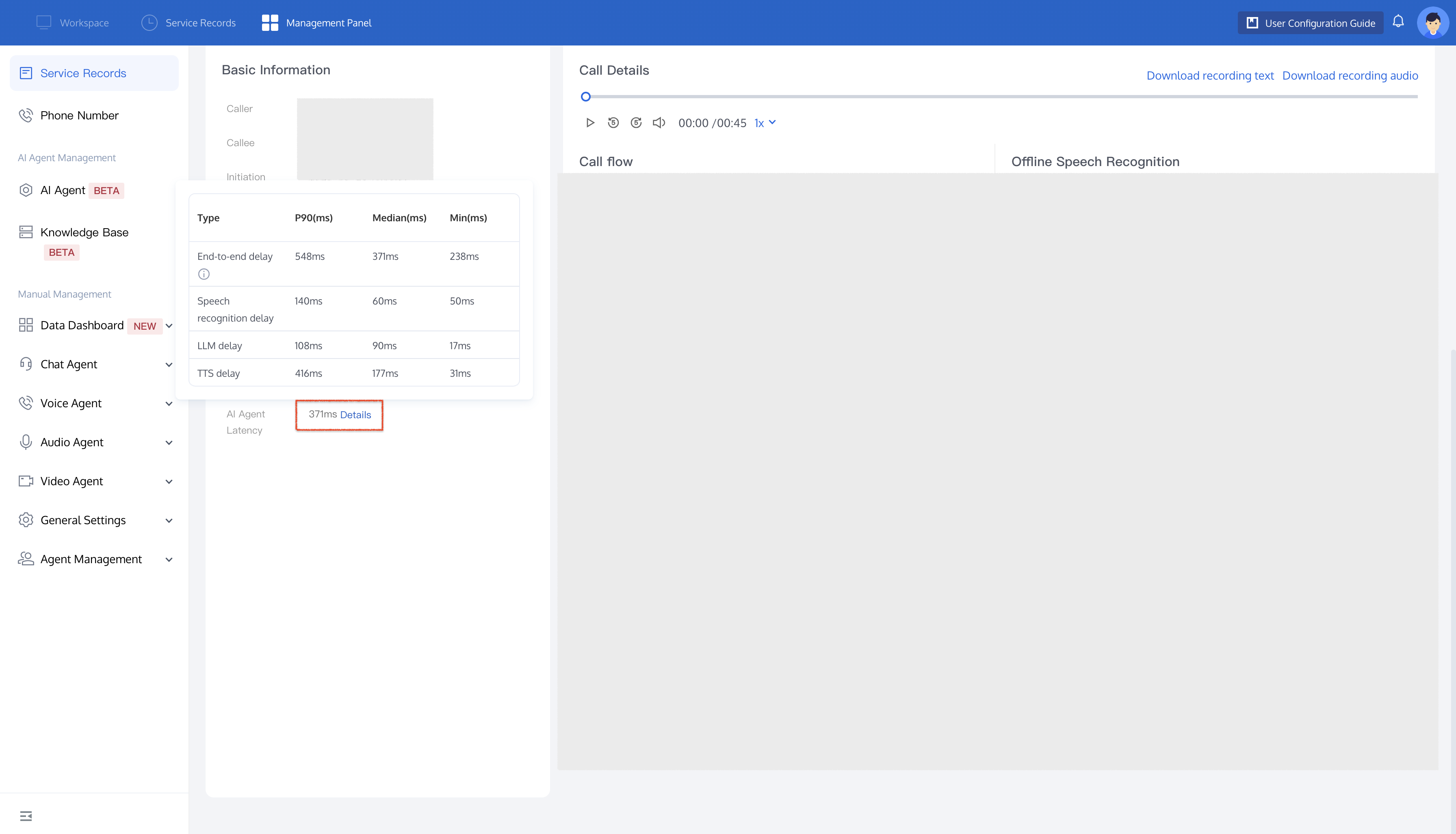 Click View Detail to access the call details page and view latency data. You can also retrieve latency data via the server API Describe AI Call Extract Result.