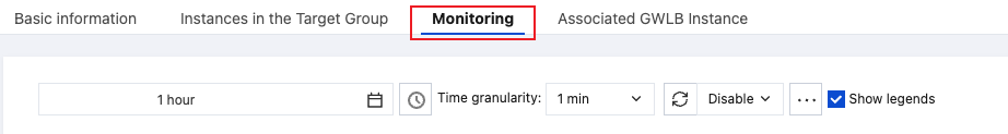 1. Log in to the GWLB console. On the GWLB instance management page, click next to the GWLB instance ID to browse the performance data of each instance in the floating window. 2. Click the GWLB instance ID to enter the GWLB details page. Then click the Monitoring tab to view the monitoring data of the current GWLB instance.