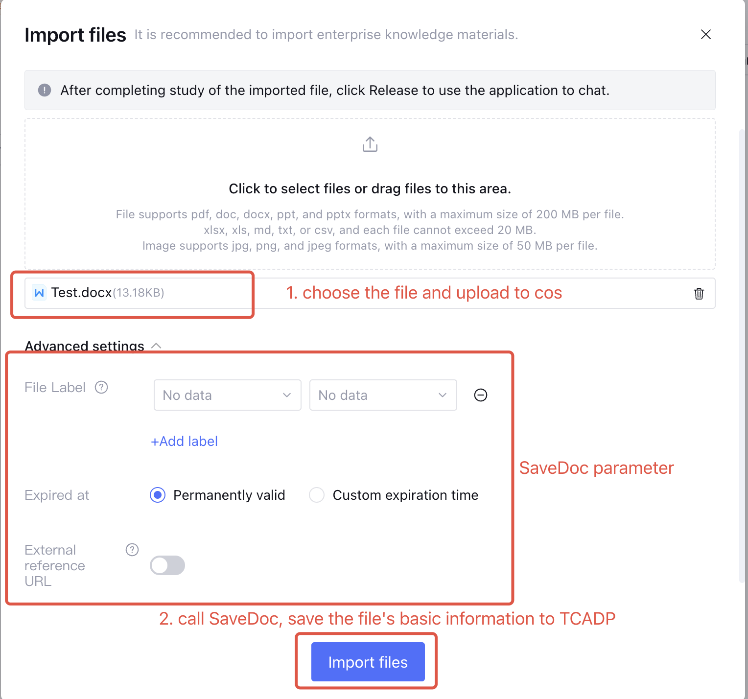2. Obtain temporary key and upload to COS via the COS SDK. 3. Call the SaveDoc API to store the basic information of the file in the Intelligent Agent development platform, as shown below: 1. Obtain Temporary Key
