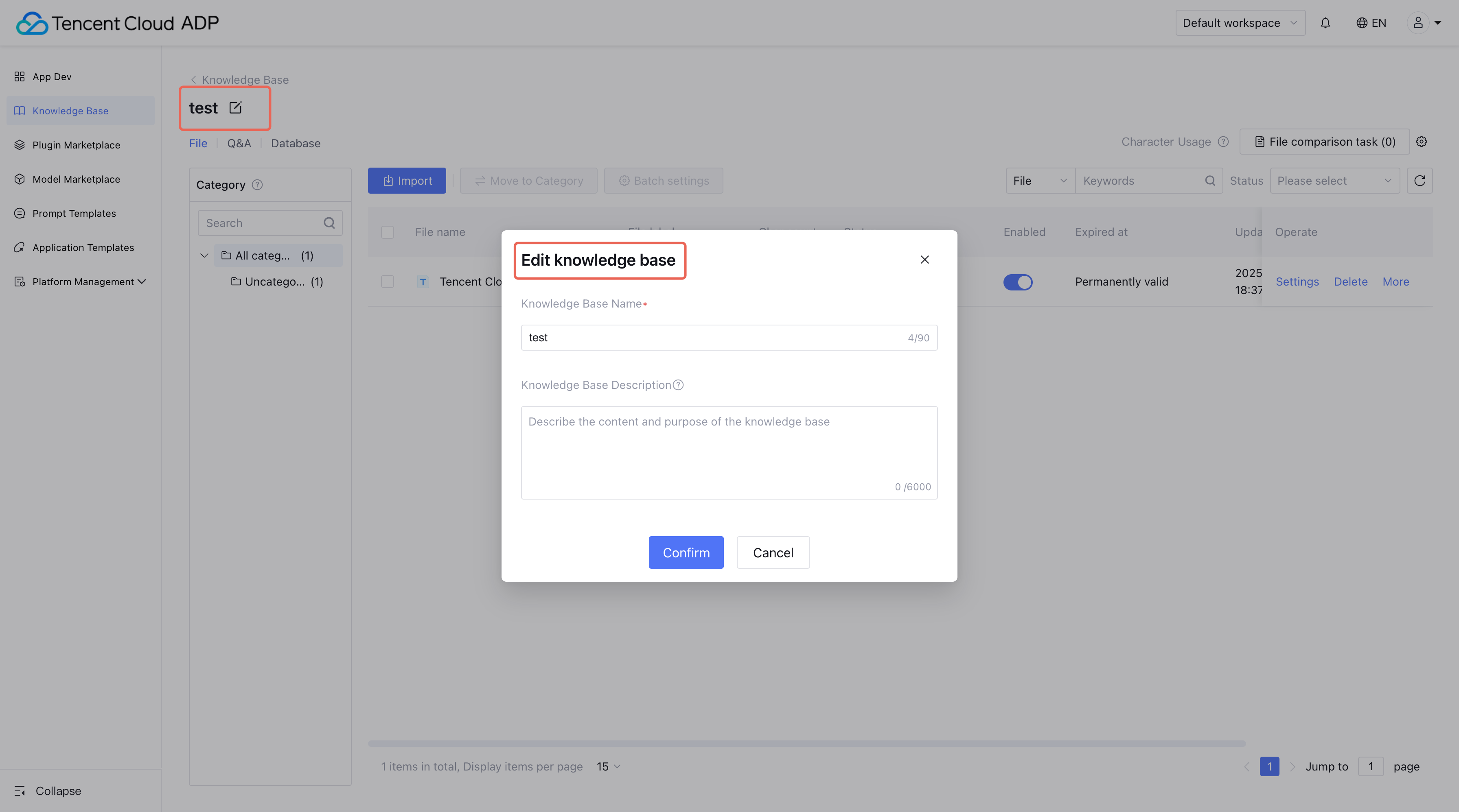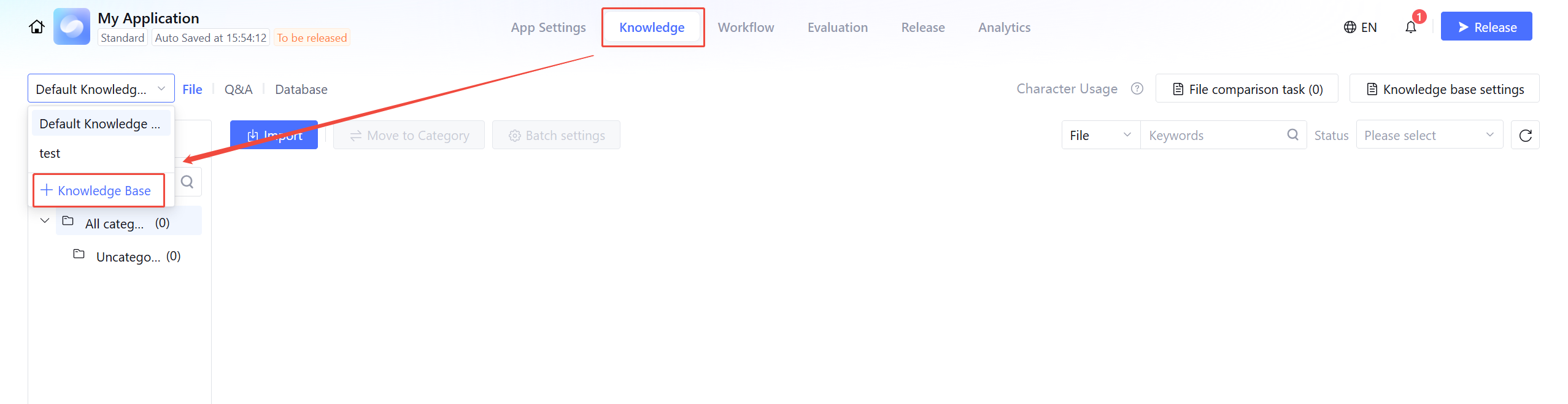 Click Knowledge Base>Create Knowledge Base in the left-hand menu, fill in the name and description.