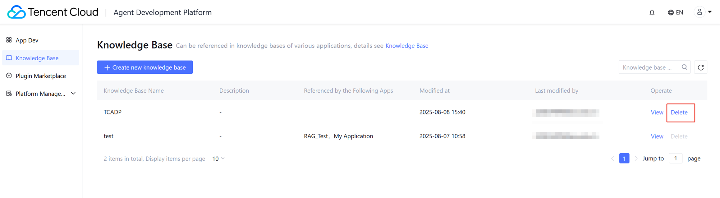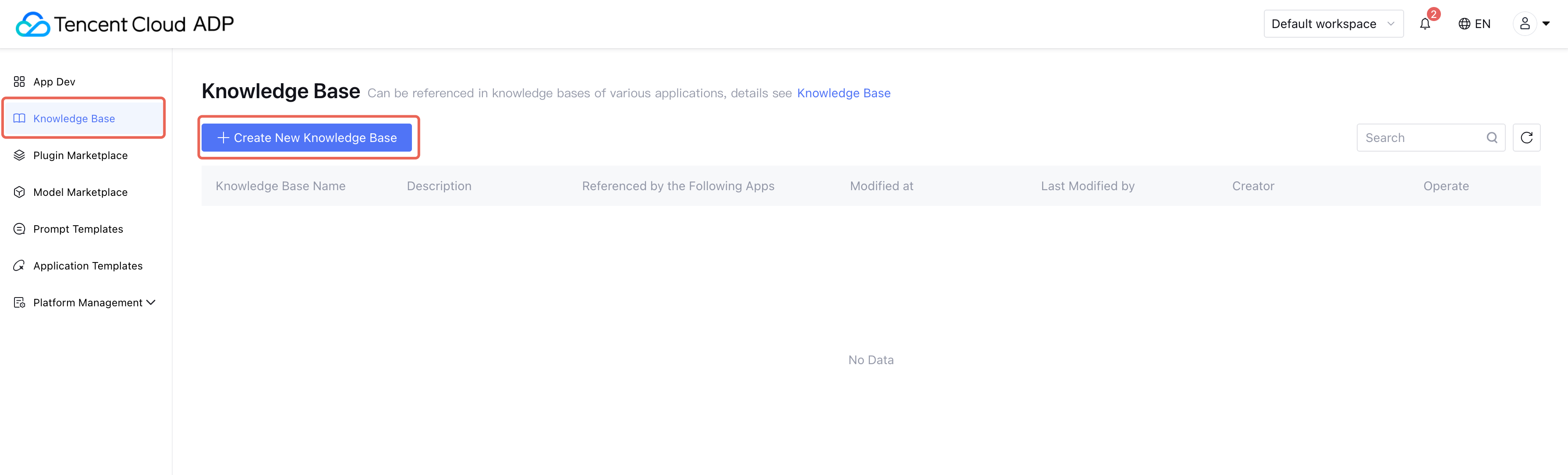 Application-level knowledge base (Knowledge Management): Each application has one default knowledge base, which can only be used within that application and cannot be shared across applications. For details, see Knowledge Base Settings. Creating a Knowledge Base