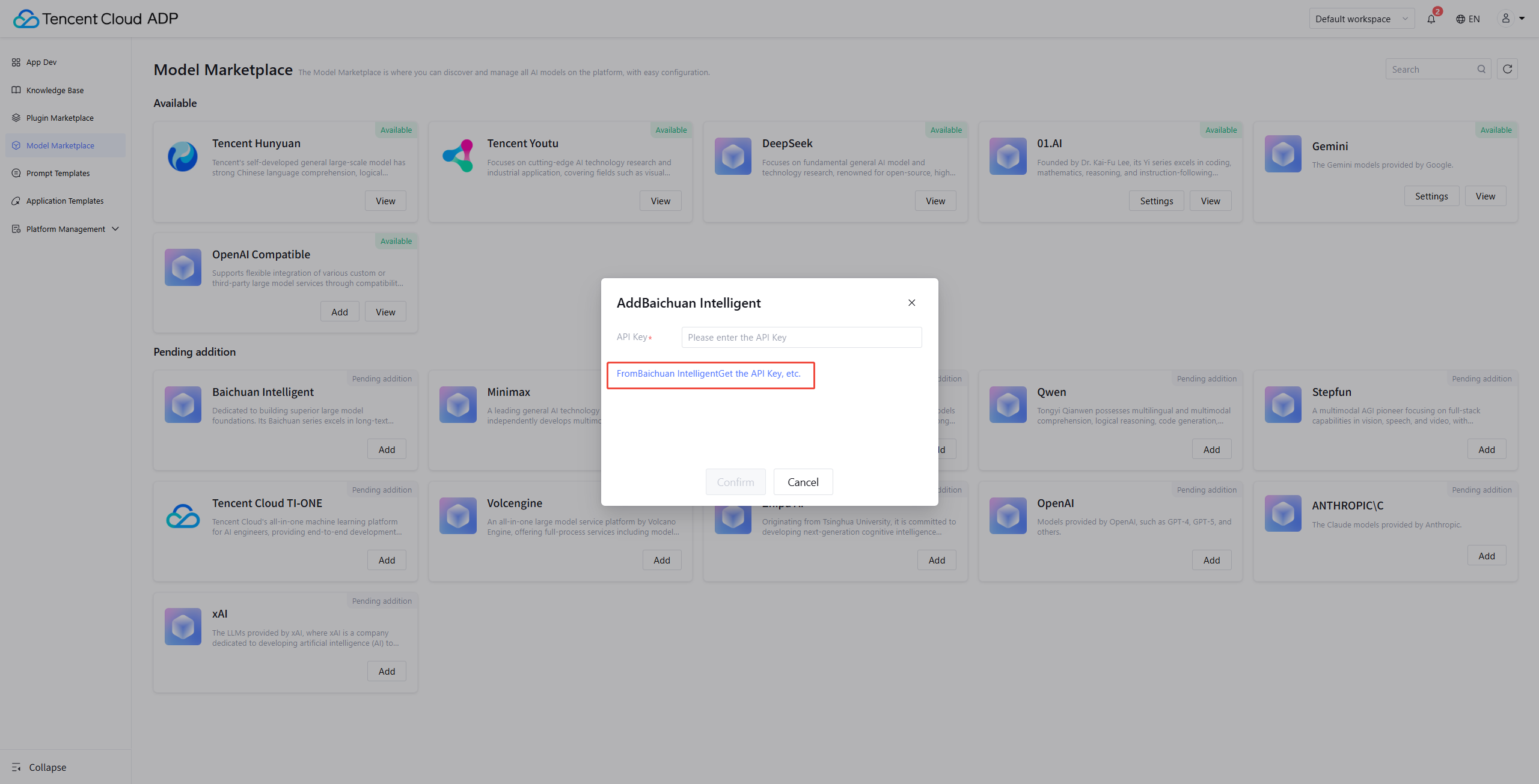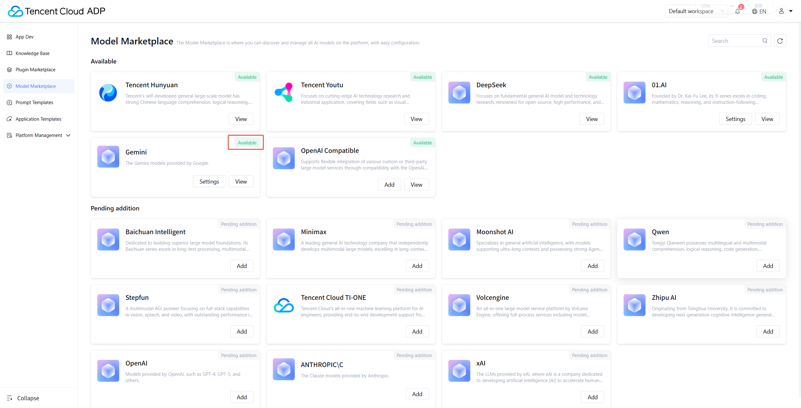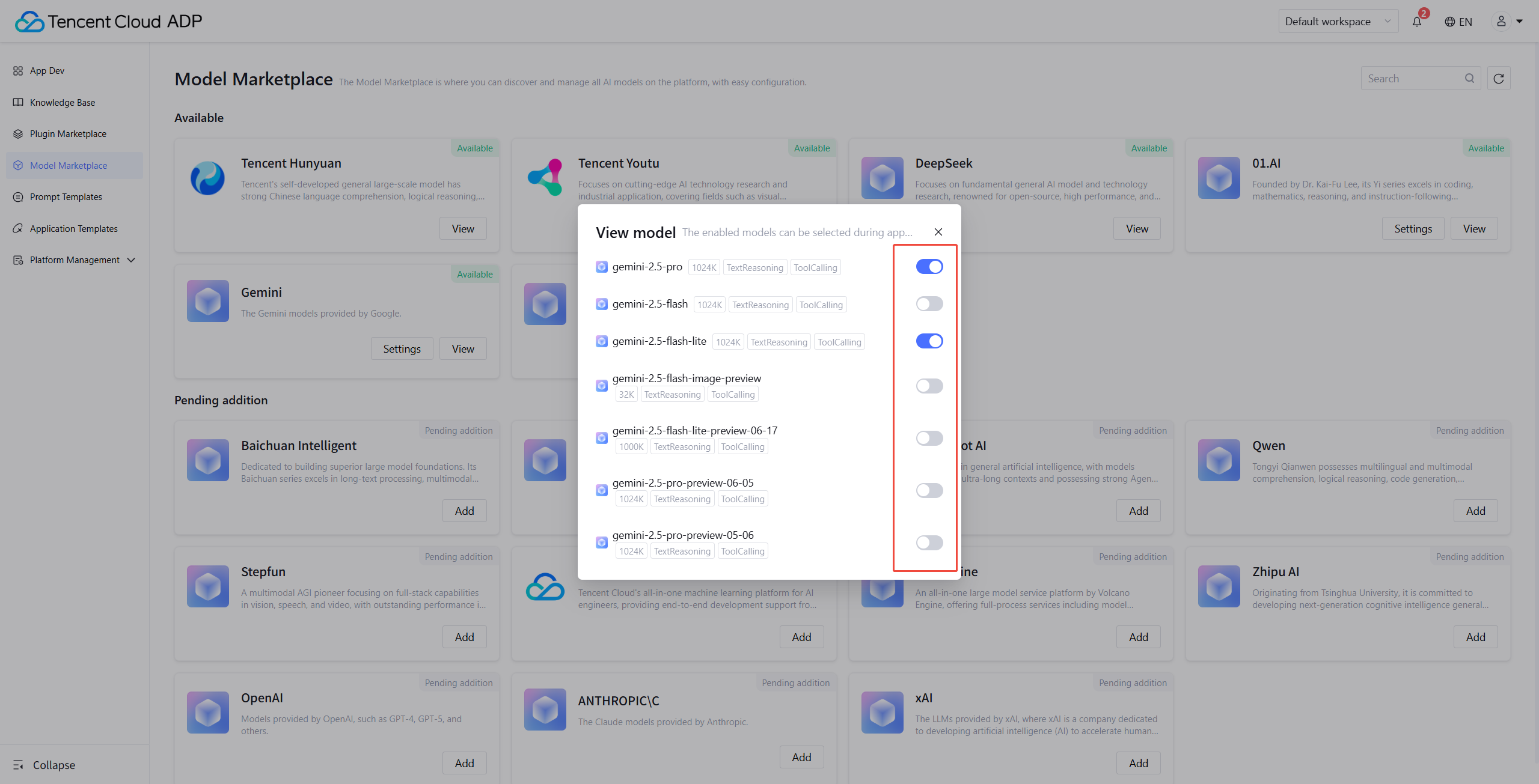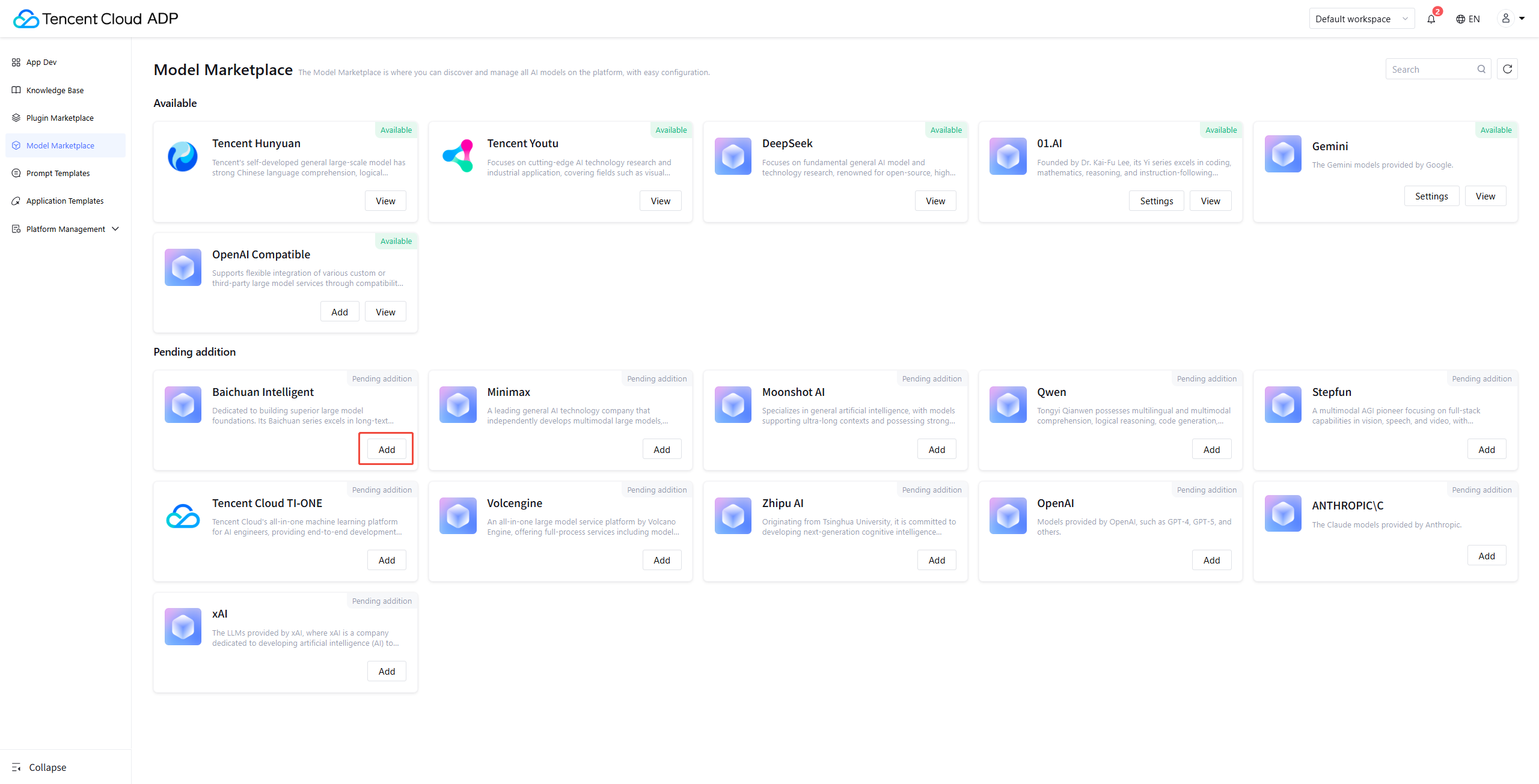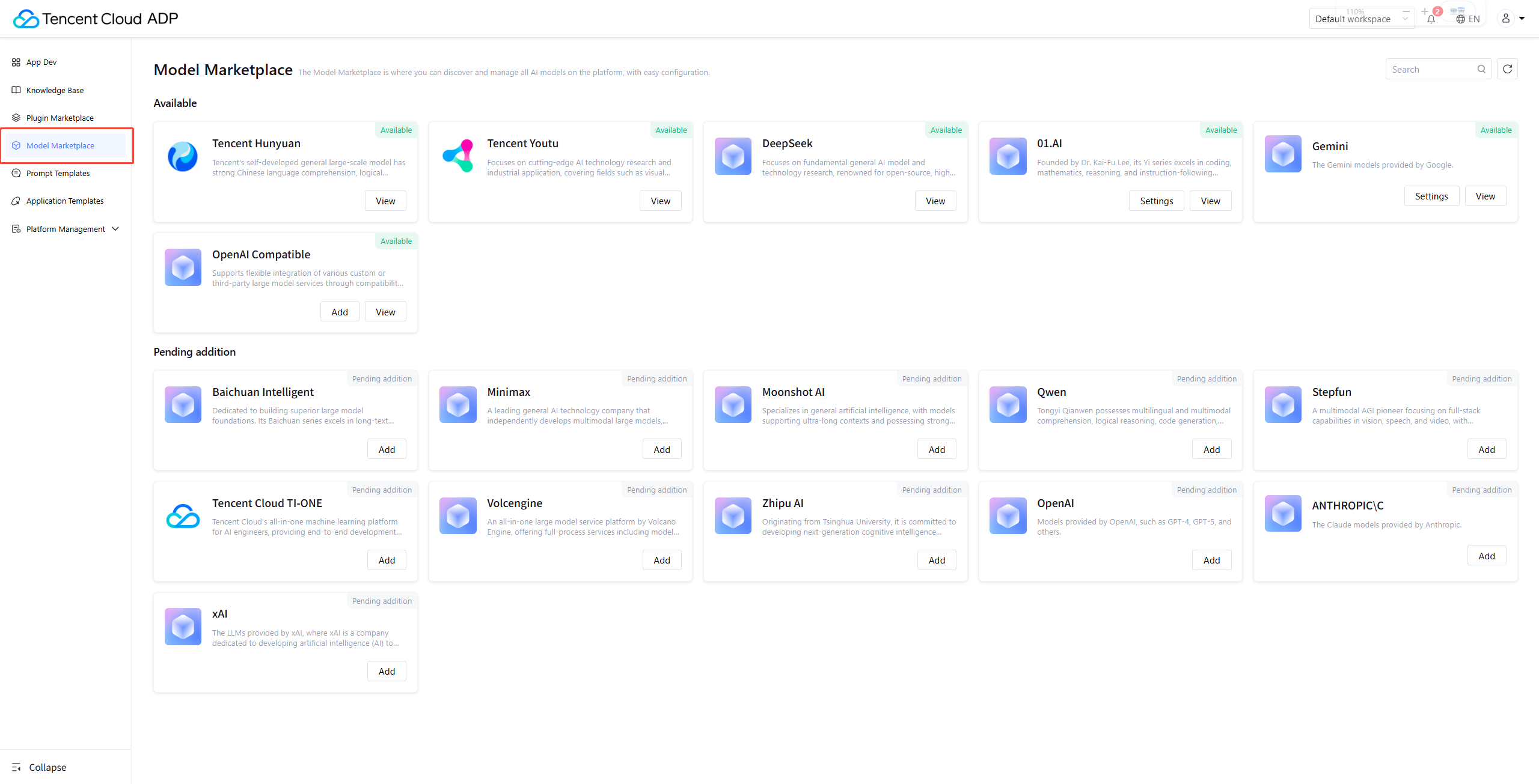 Tencent Cloud Agent Development Platform offers various underlying model call options. Settings can be done in Model Marketplace.