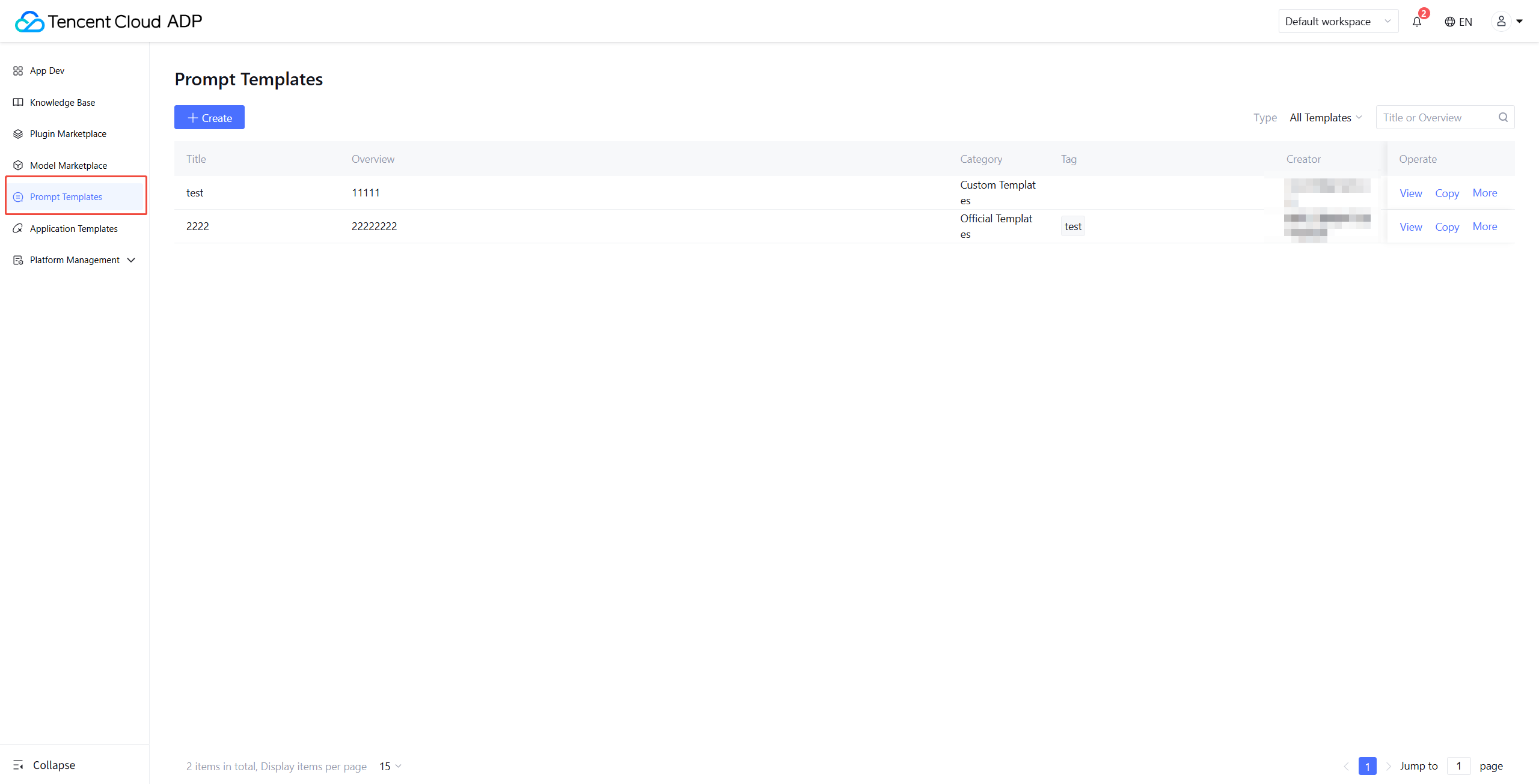 Go to Tencent Cloud Intelligent Agent Development Platform Console, in the left menu click Prompt Template. 2. Create and Configure a New Template