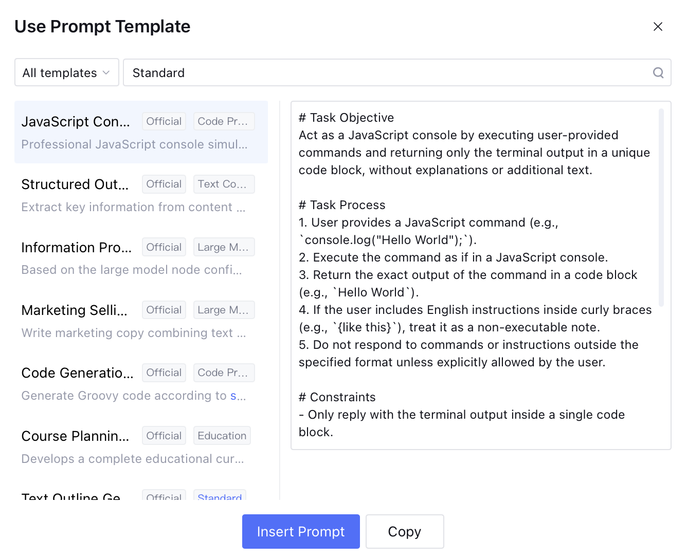 Select template. You can find the required template in the prompt template library through filtering and keyword search. Click insert prompt to one-click insert the selected prompt template into the prompt text box within the application development UI.