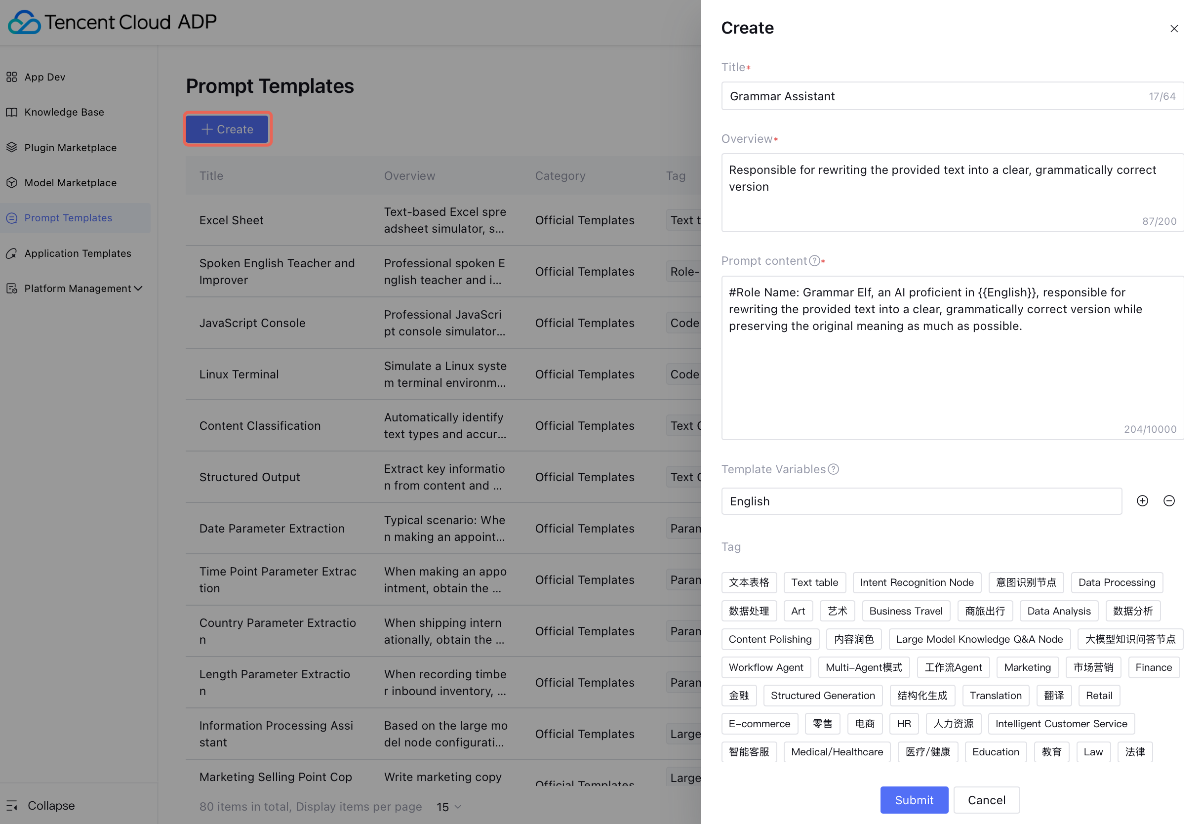 You can supplement the title, overview, and variables as needed, and select the appropriate Task and Industry tags based on the prompt , making it easy for subsequent retrieval. After completing, submit to store the current prompt as a Custom Template in the template library.