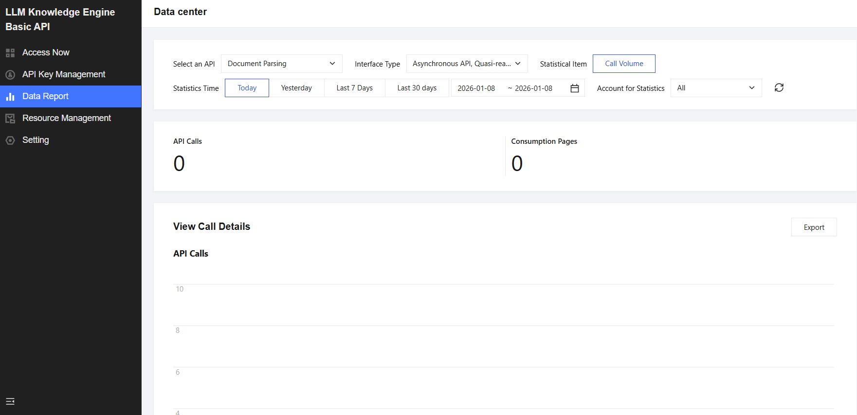 After the API is integrated and in use, you can navigate to Console > Data Report, select an interface and model to view usage details, and filter the data by dimensions such as Account and API Key.