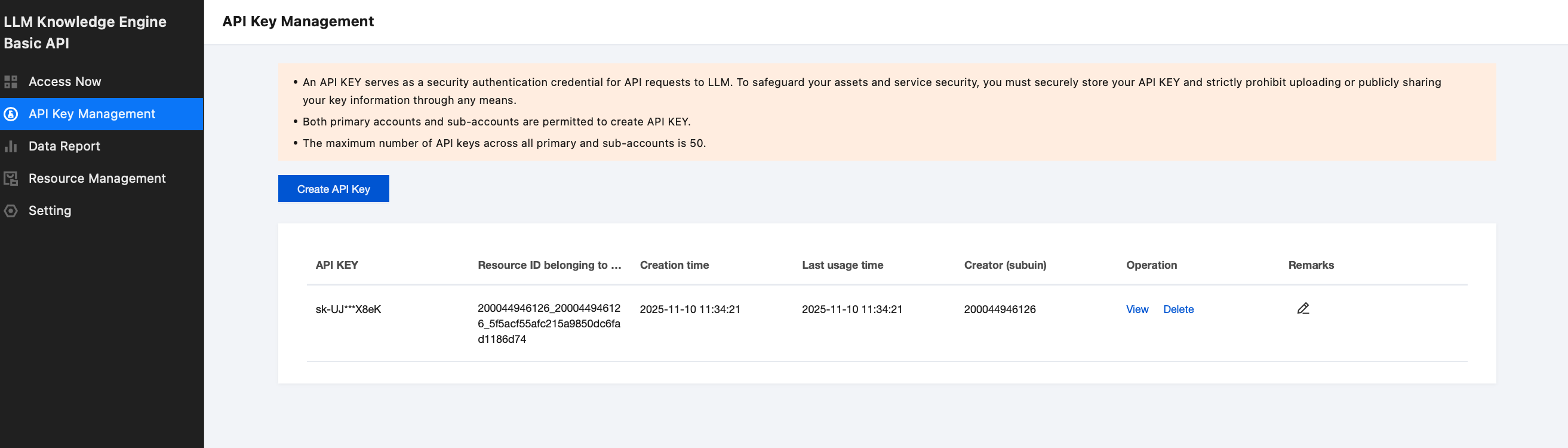 2. After creation, enter API Key Management, where you can perform operations such as adding new, viewing, deleting, and remarking API Keys. Note: