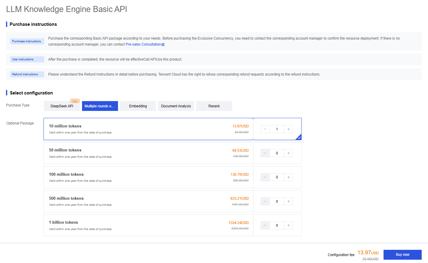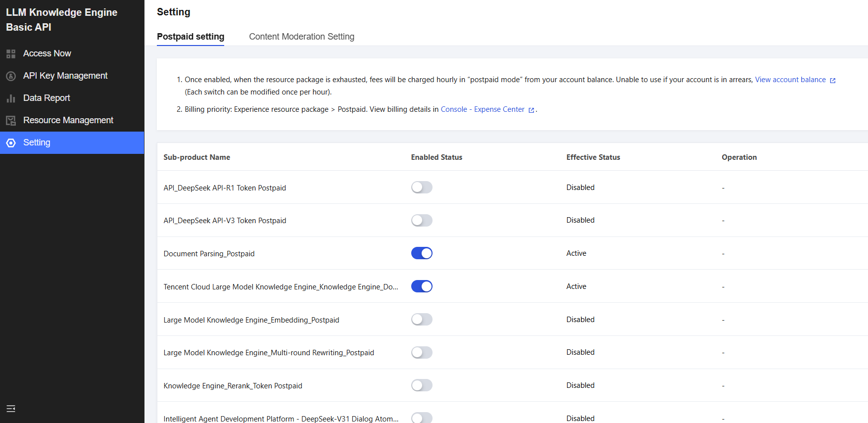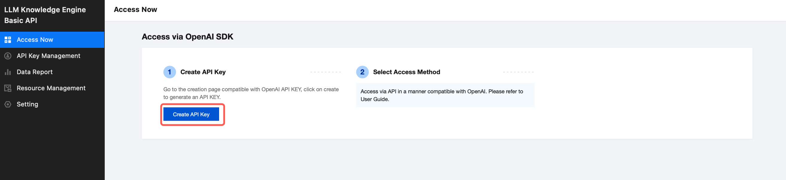 LLM Knowledge Engine Basic API is now open to the public. You can go to the Console to activate the service. After enabling the service, you need to purchase the corresponding resource package or enable postpaid billing to use it. For specific billing rules of resource packages and postpaid, please refer to Billing Overview. Step 3: API Integration