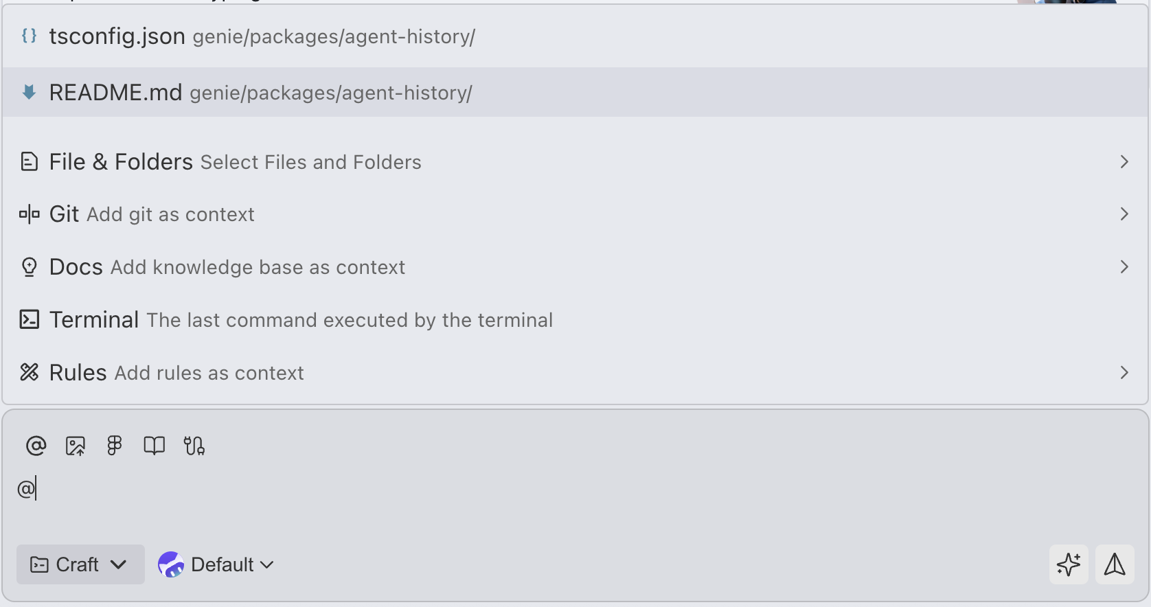 Use the @ symbol to quickly reference various types of context. After typing @, the system displays a list of available context types.