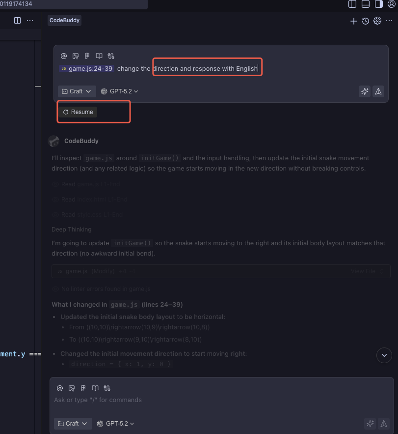 A Checkpoint, also known as Restore to this checkpoint, is a core version rollback and state recovery feature in CodeBuddy IDE. During the coding process with Craft Agent, every time a conversation results in file changes, Craft automatically creates a checkpoint for those changes and manages versioning. You can simply hover your mouse over previous conversation versions to select rollback or re-edit options. This feature is specifically designed to handle accidental operations, experimental code failures, or requirement changes during the coding process. Below is an introduction to how it works.