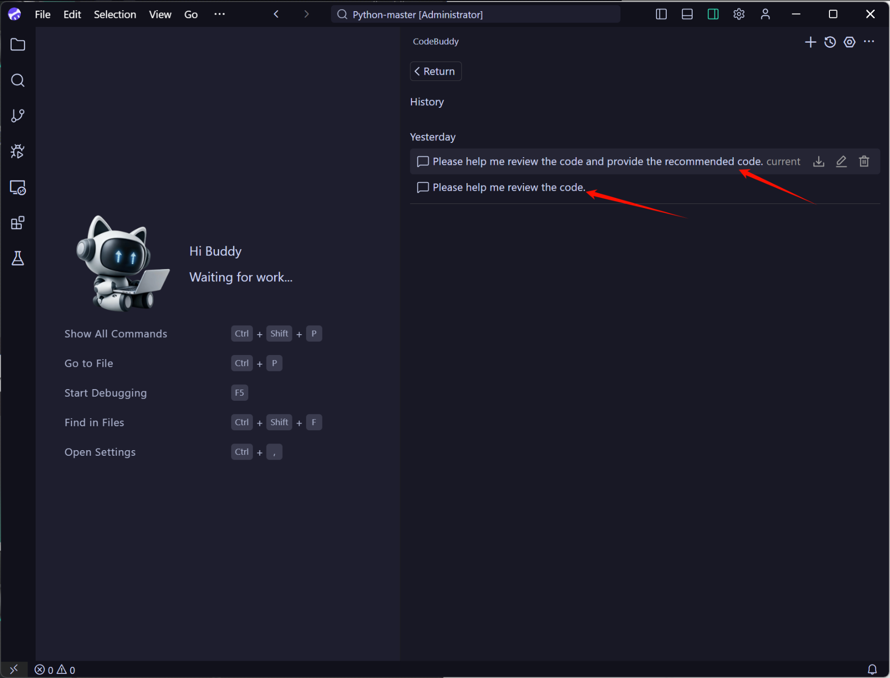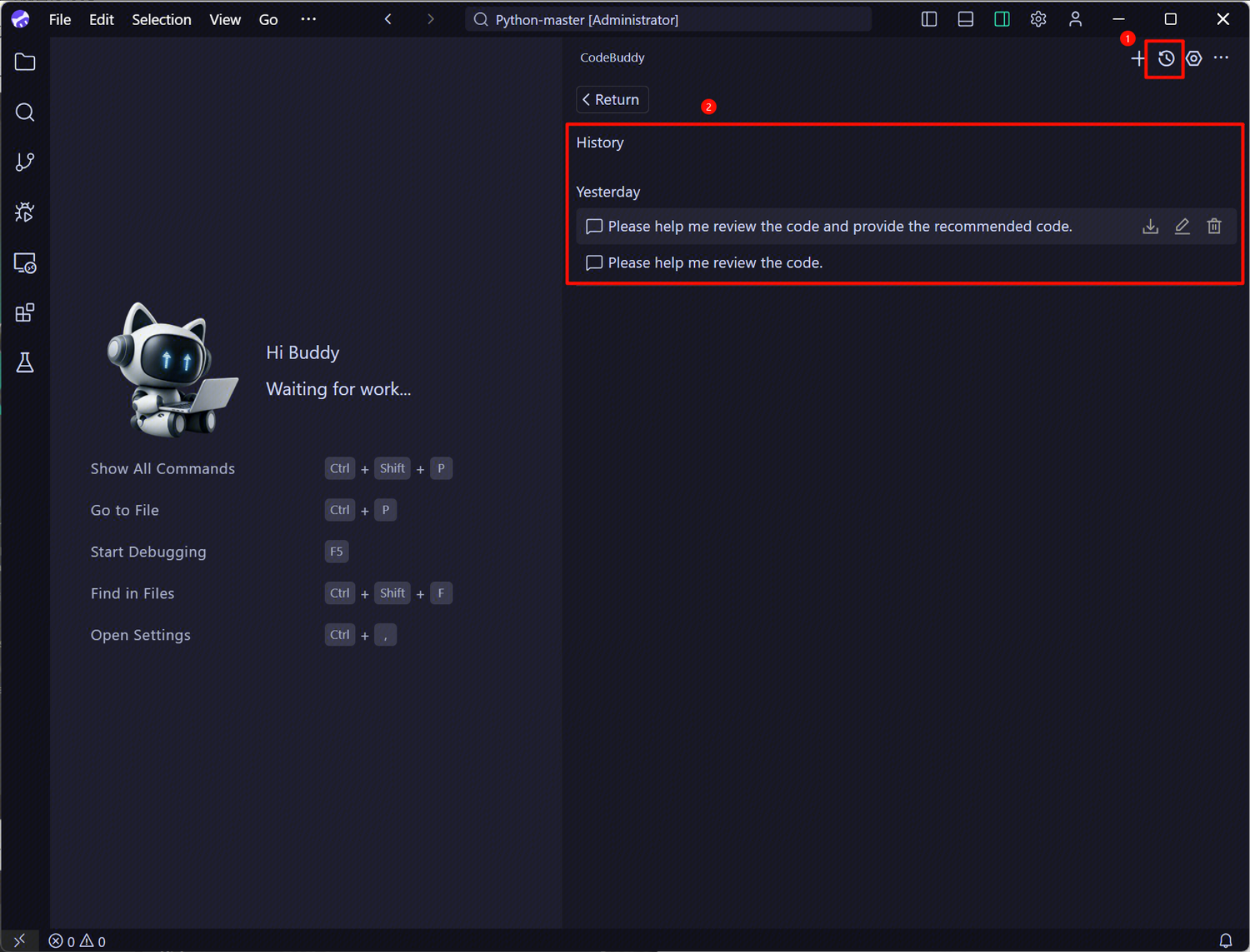 In the upper right corner of the CodeBuddy IDE sidebar conversation panel, click the History button to view the list of historical conversations.