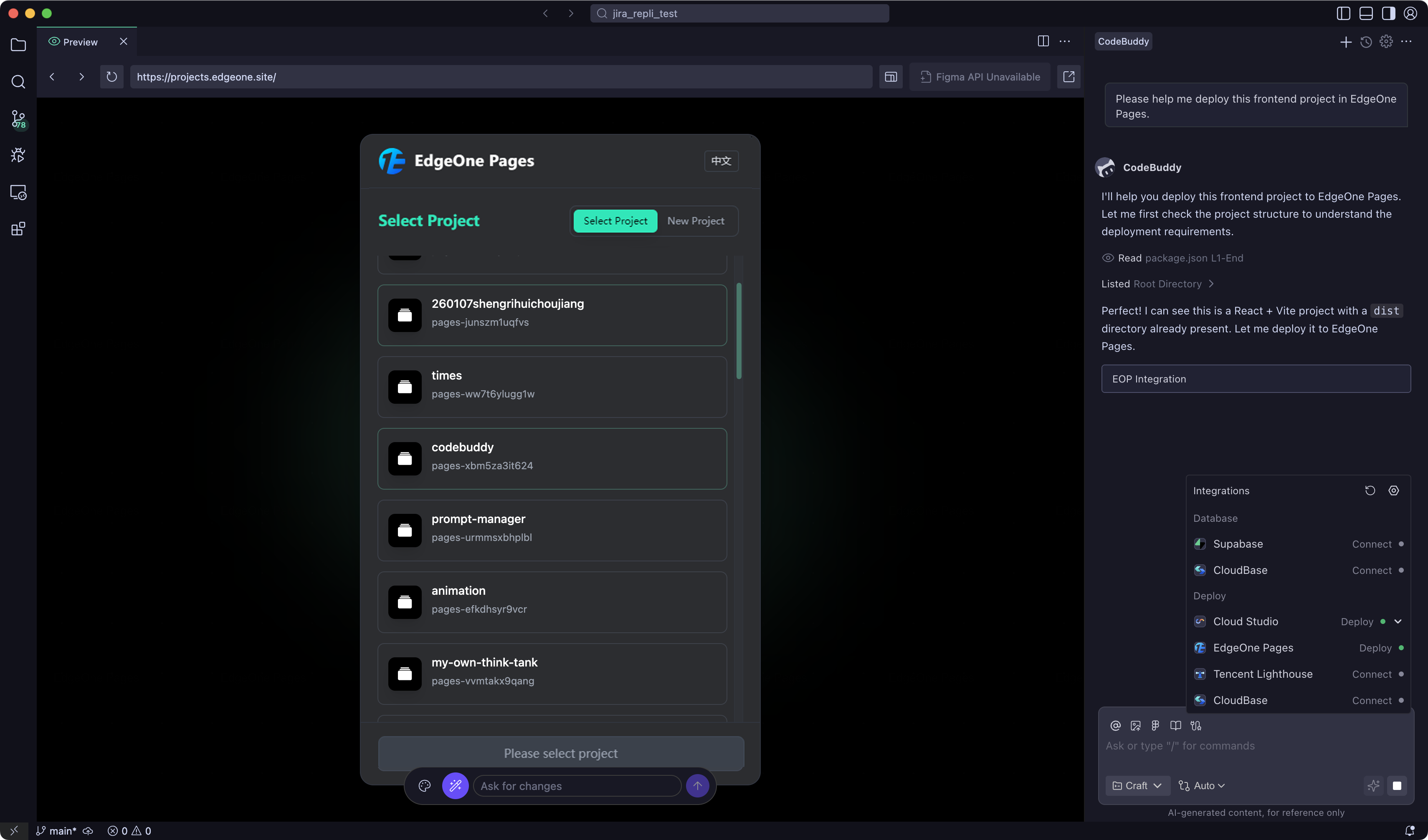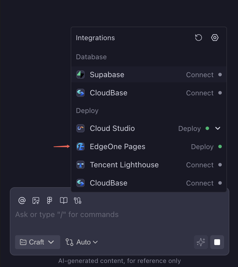 CodeBuddy provides multiple deployment entrances to help you gradually deliver projects from development preview and team integration to online environments. You can choose the appropriate deployment method based on the form of your project deliverables (static site, server-side application, Serverless application, etc.). All entrances support completing the connection, configuration, and publishing processes within CodeBuddy, reducing repetitive configuration costs.