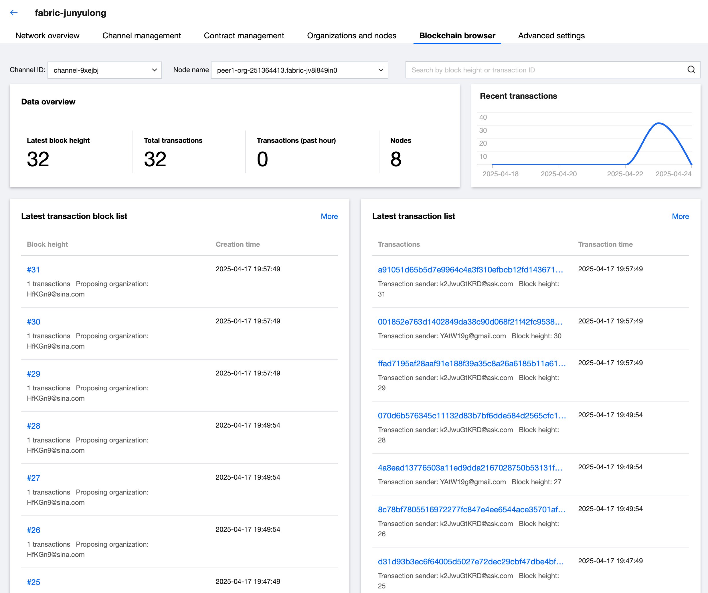 1. In the TBaaS Console, select Fabric > Blockchain Network in the left sidebar to enter the network card page, and click the corresponding card to enter the network details page. 2. On the network details page, select the Blockchain Browser tab to enter the corresponding page and view or retrieve block information, transaction information and other data in real time. You can also switch different Channel IDs to view the on-chain data of different channels. As shown below: