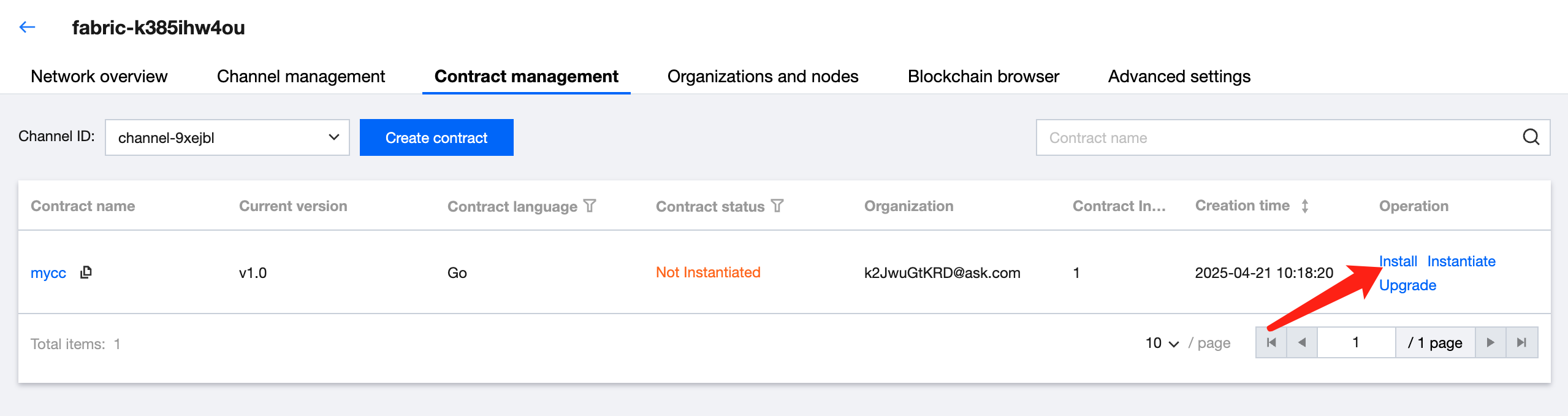 The installed contract can be instantiated. On the Contract Management page, click Instantiate in the list operation column of the contract list. In the instantiation pop-up, you can set the endorsement policy, private data set and other information as needed. After confirmation, you can start instantiation. As shown below: