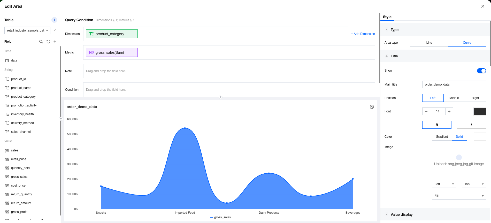 1. Enter to the canvas, add an area chart component, then set the dimension and metric. 2. Select Quick Calculation > Cumulative > Total Cumulative in the metric field.