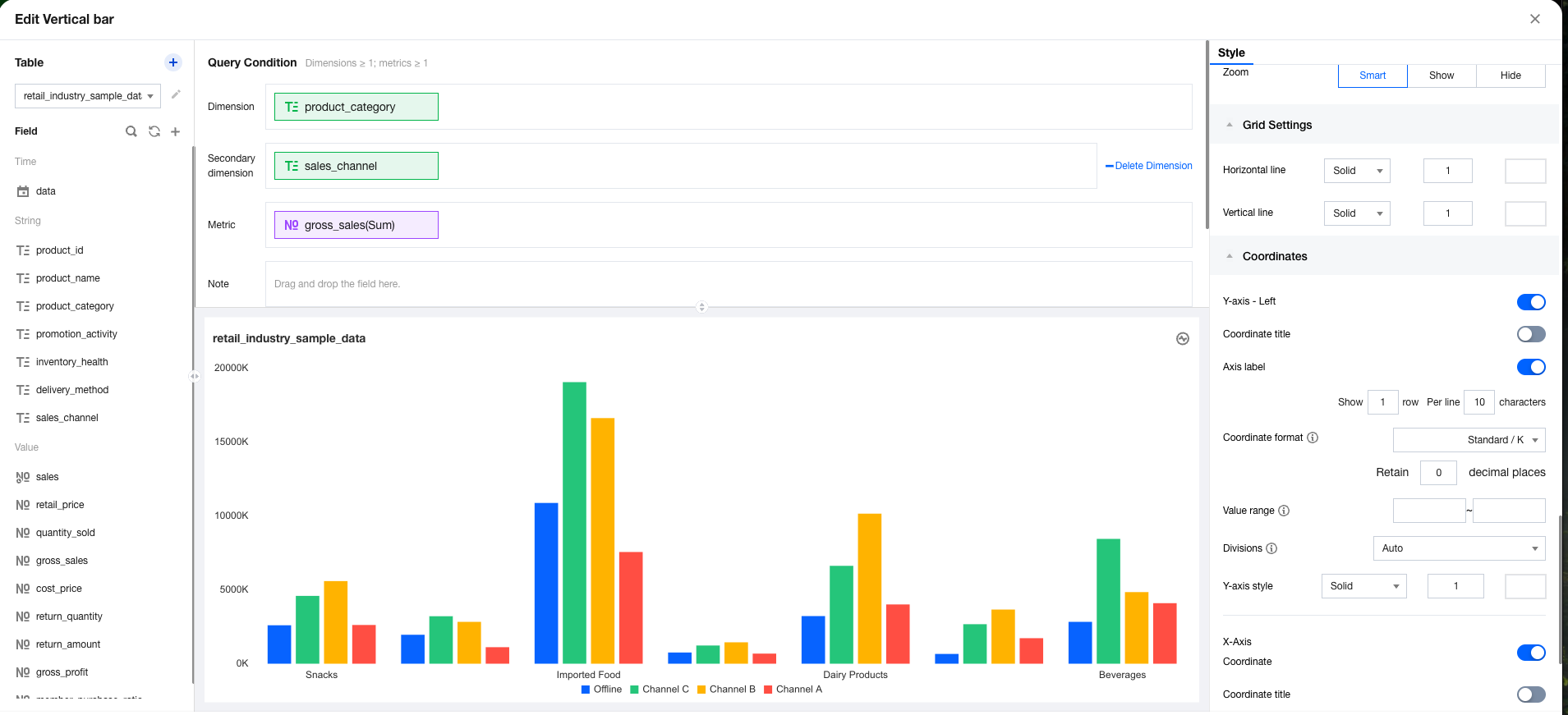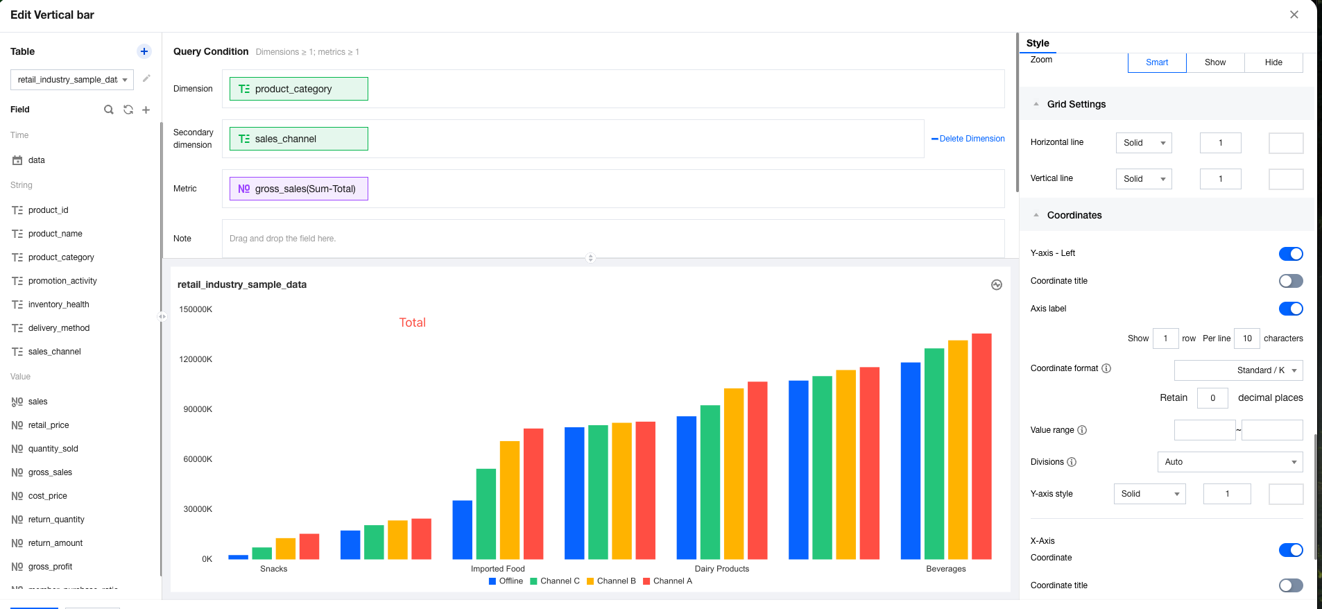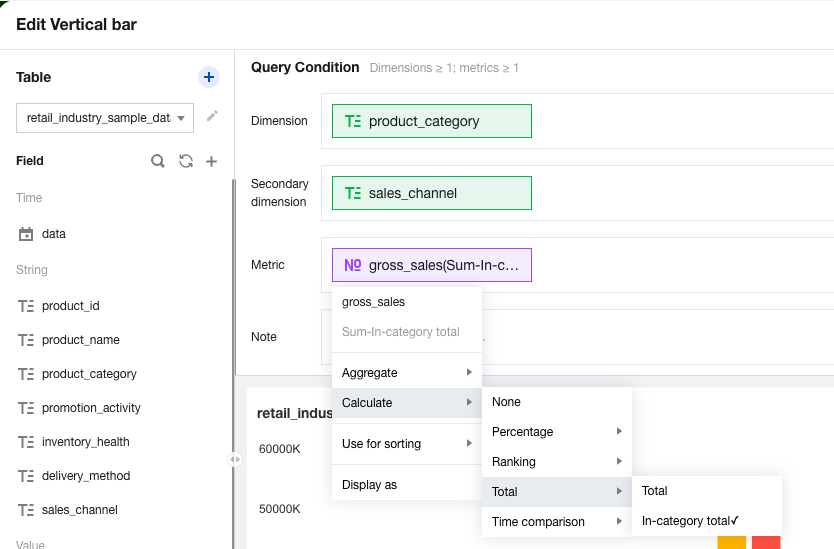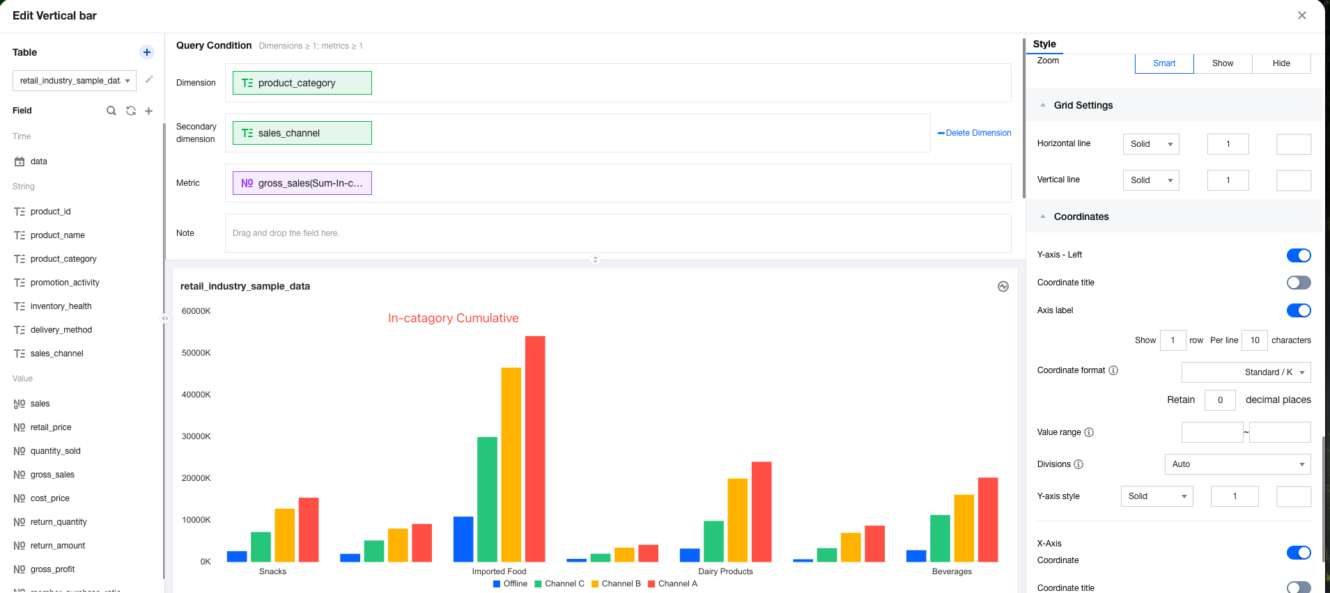 1. Enter the canvas, add a column chart component, then set the dimension, sub-axis, and metric. 2. In the metric field, select Quick Calculation > Cumulative > Intra-group Cumulative sequentially.