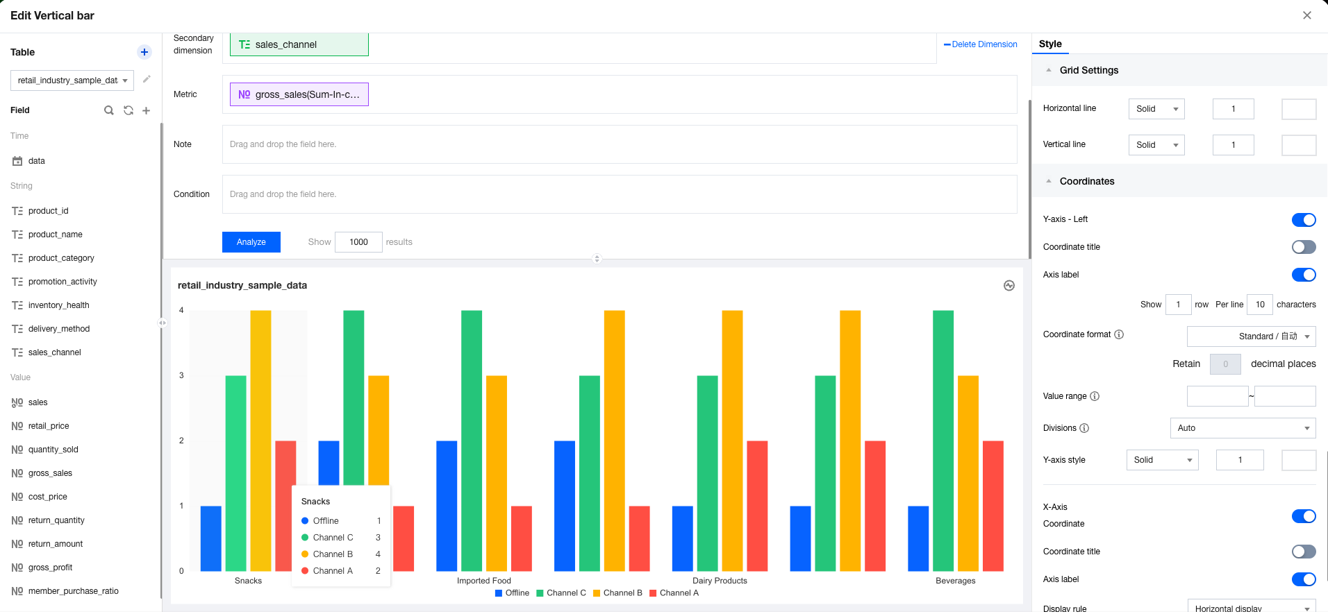 1. Enter the canvas, add a column chart component, then set the dimension, sub-axis, and metric. 2. In the metric field, select quick calculation, ranking, and then ascending within group sequentially.
